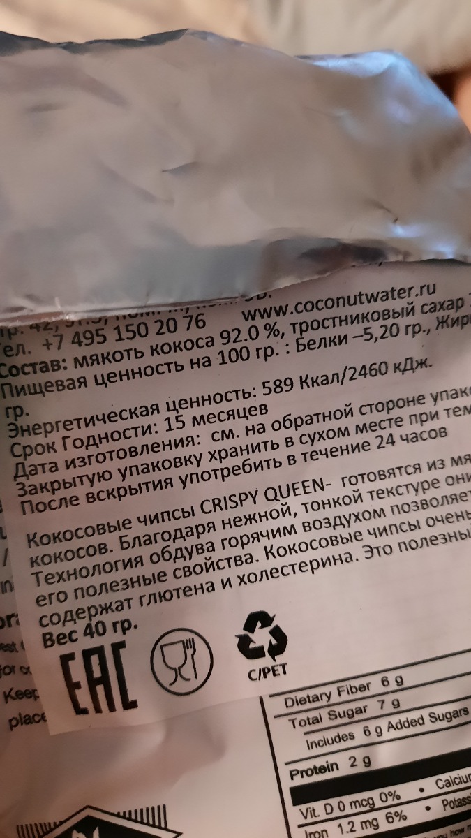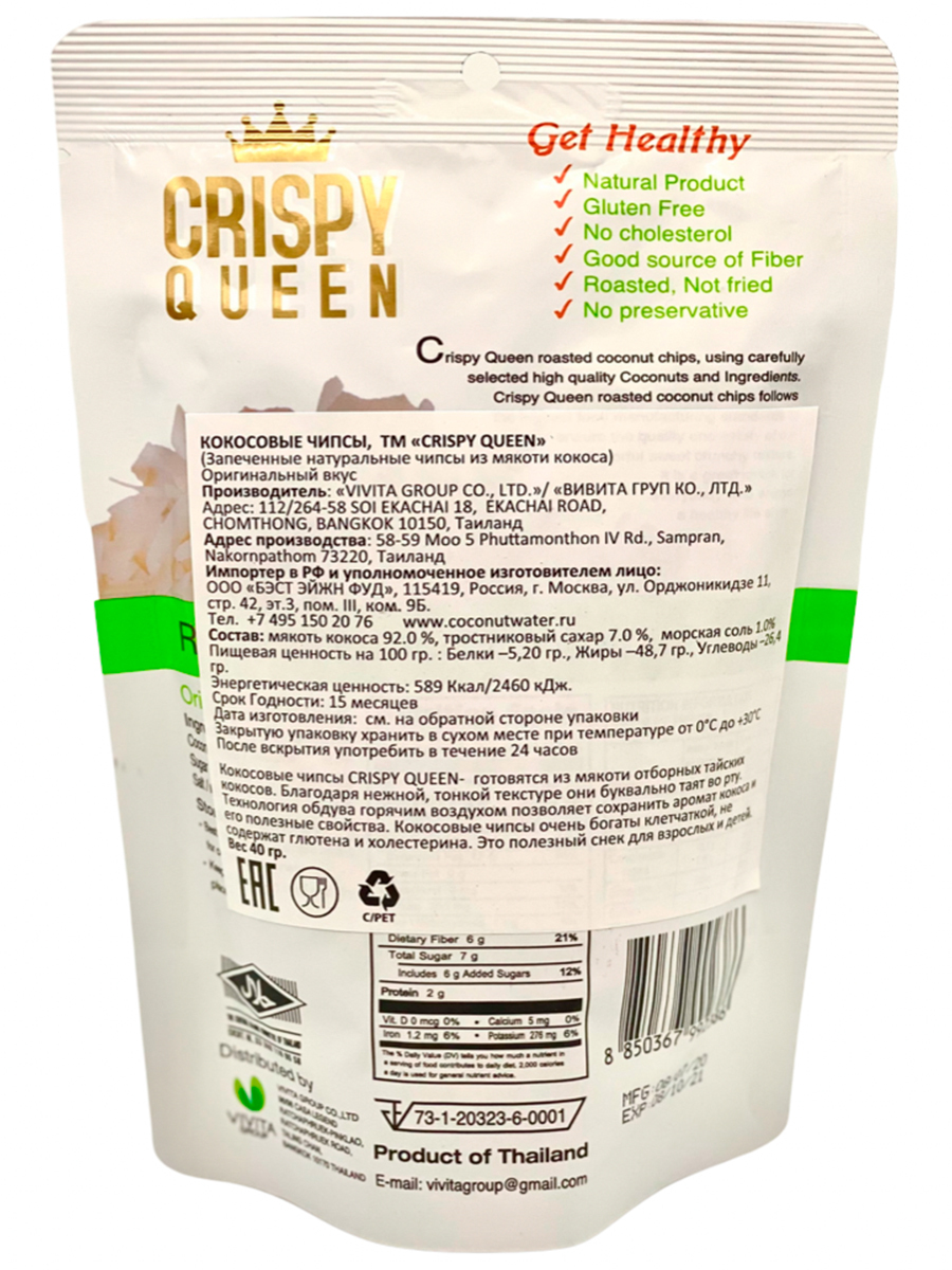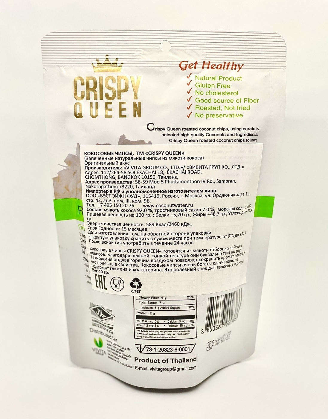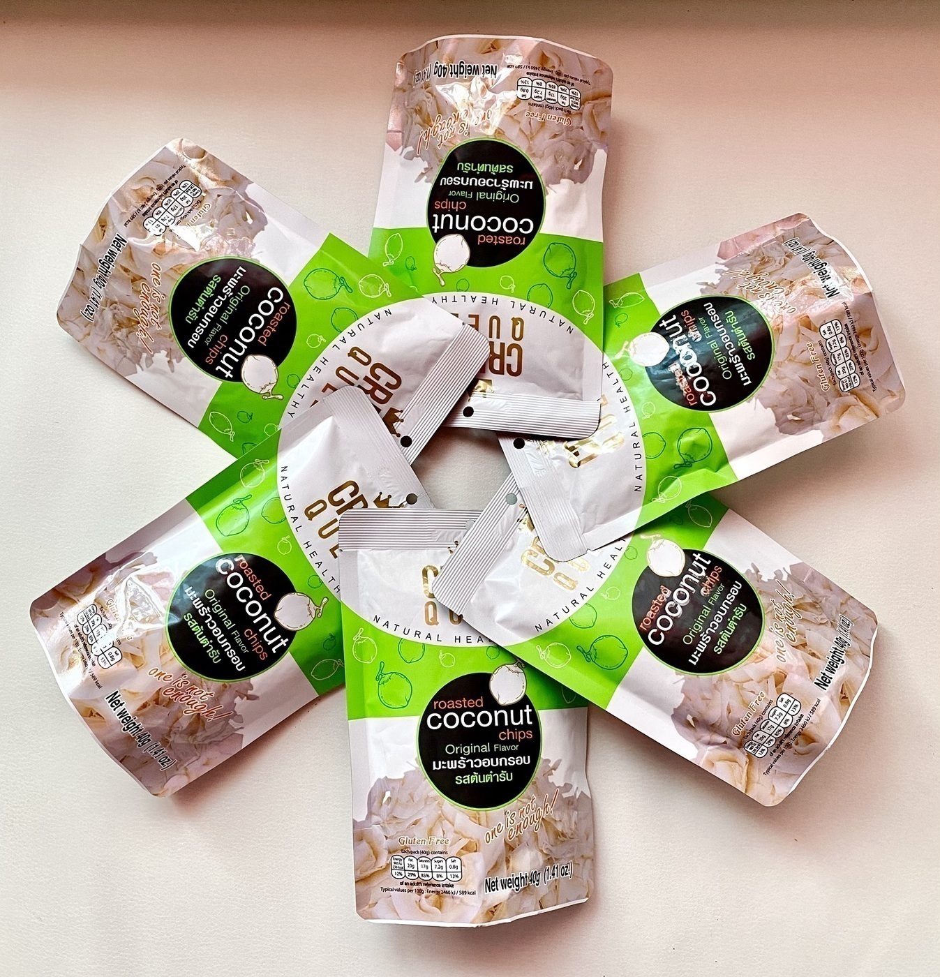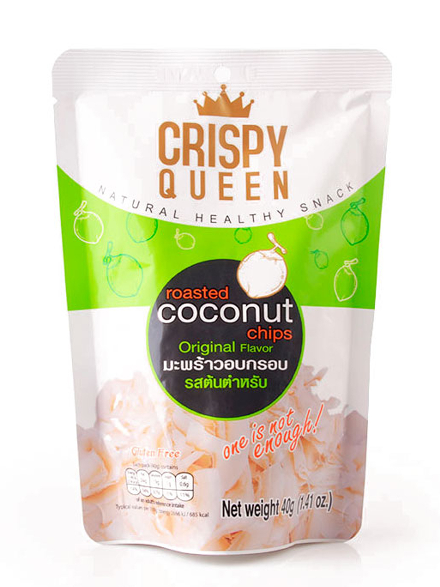 КОКОСОВЫЕ ЧИПСЫ CRISPY QUEEN 2шт по 40г/ НАТУРАЛЬНЫЕ ПРОДУКТЫ СНЕКИ СУХОФРУКТЫ СУПЕРФУД СТРУЖКА ИЗ КОКОСА ТАИЛАНД