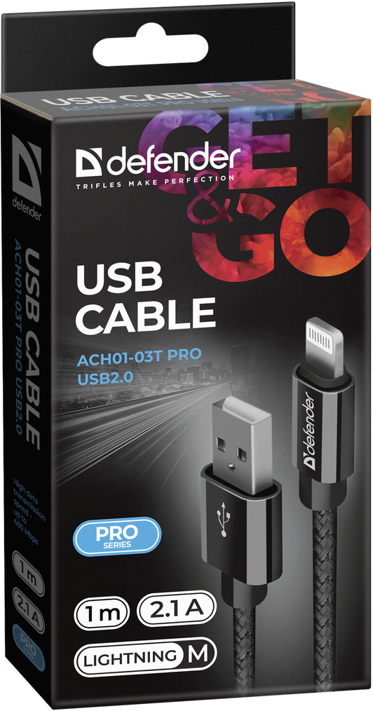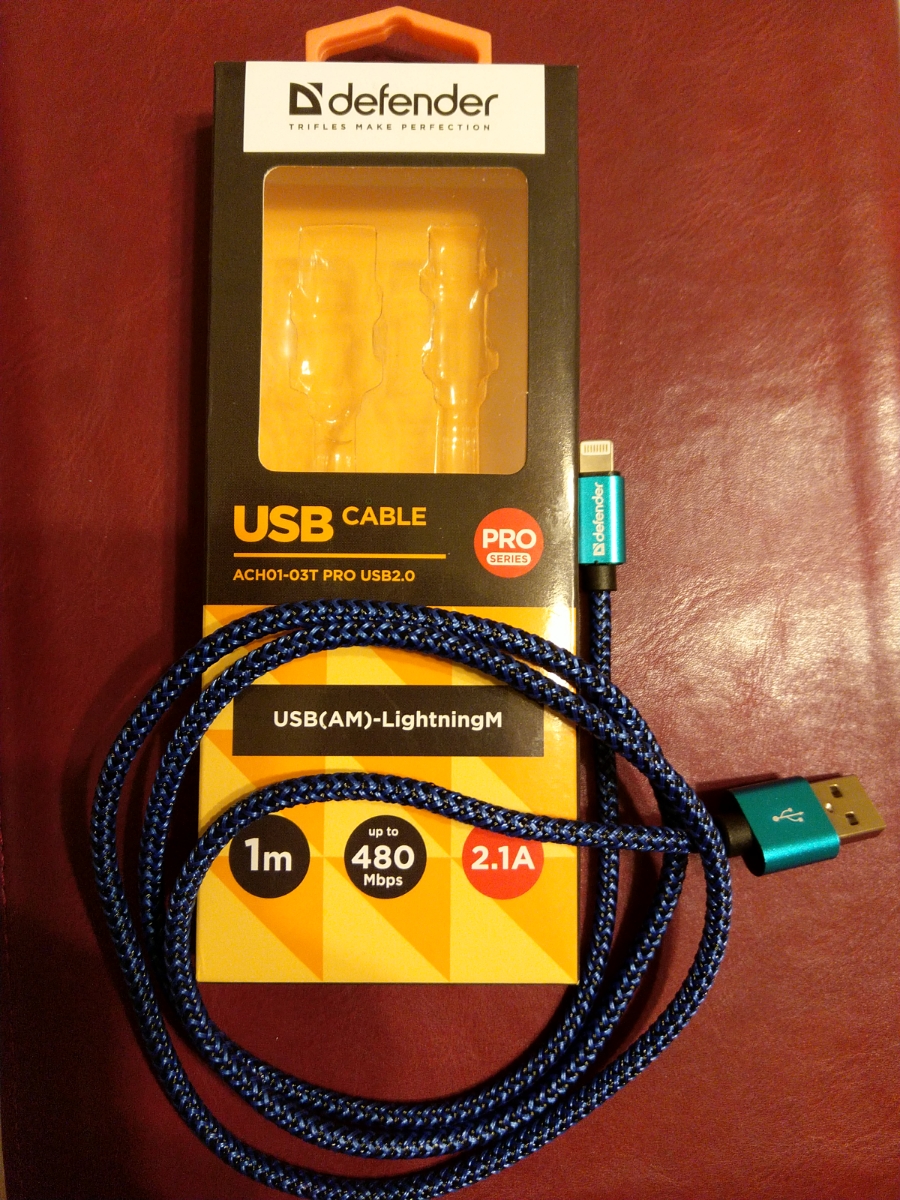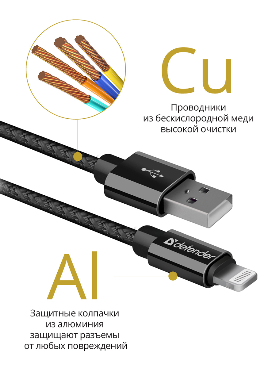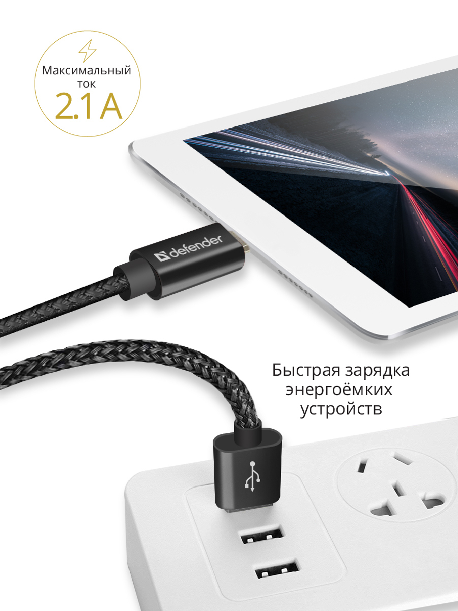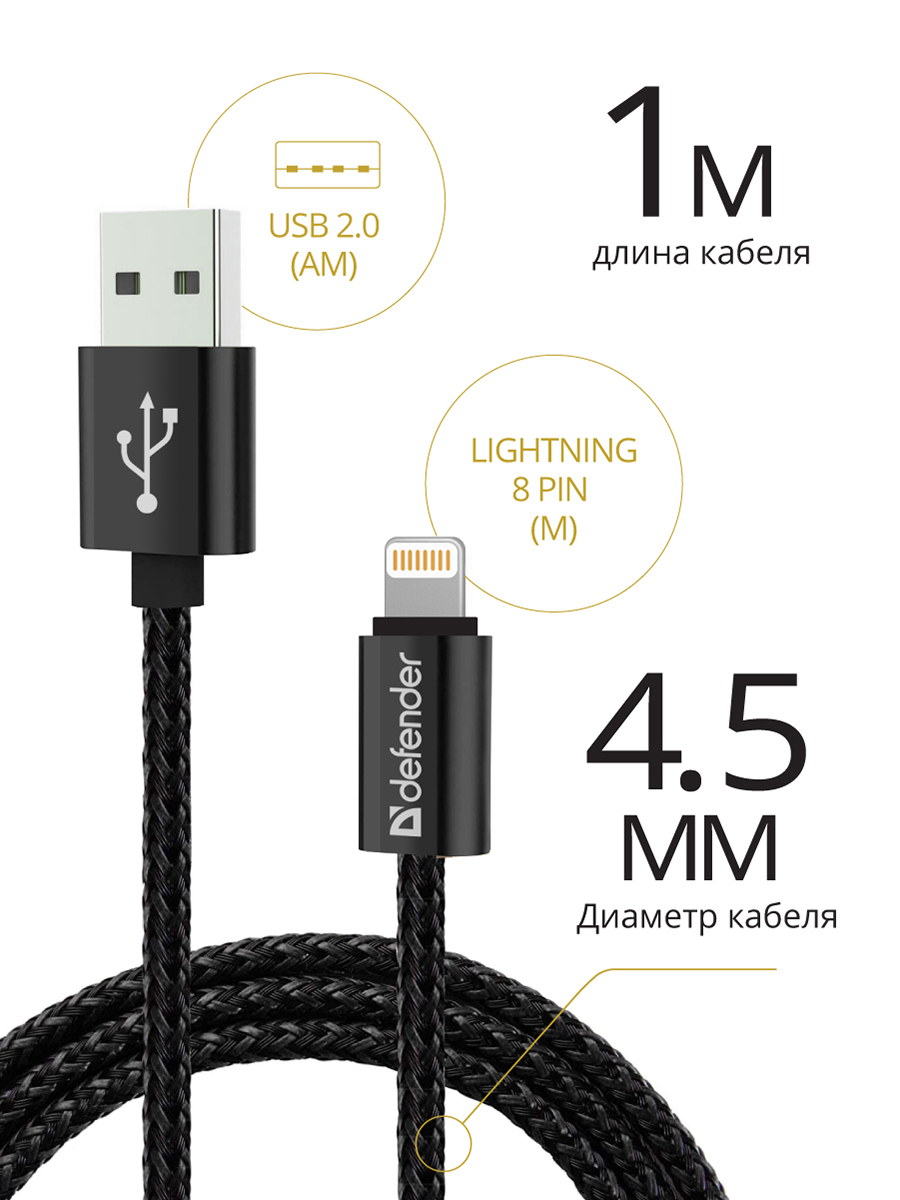Кабель для зарядки телефона Lightning USB для Apple iPhone, Defender PRO 2.1A, 1 метр, черный