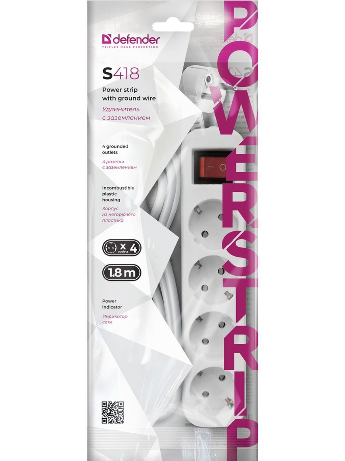 Удлинитель сетевой Defender 4 розетки с заземлением , 1.8 метра , выключатель