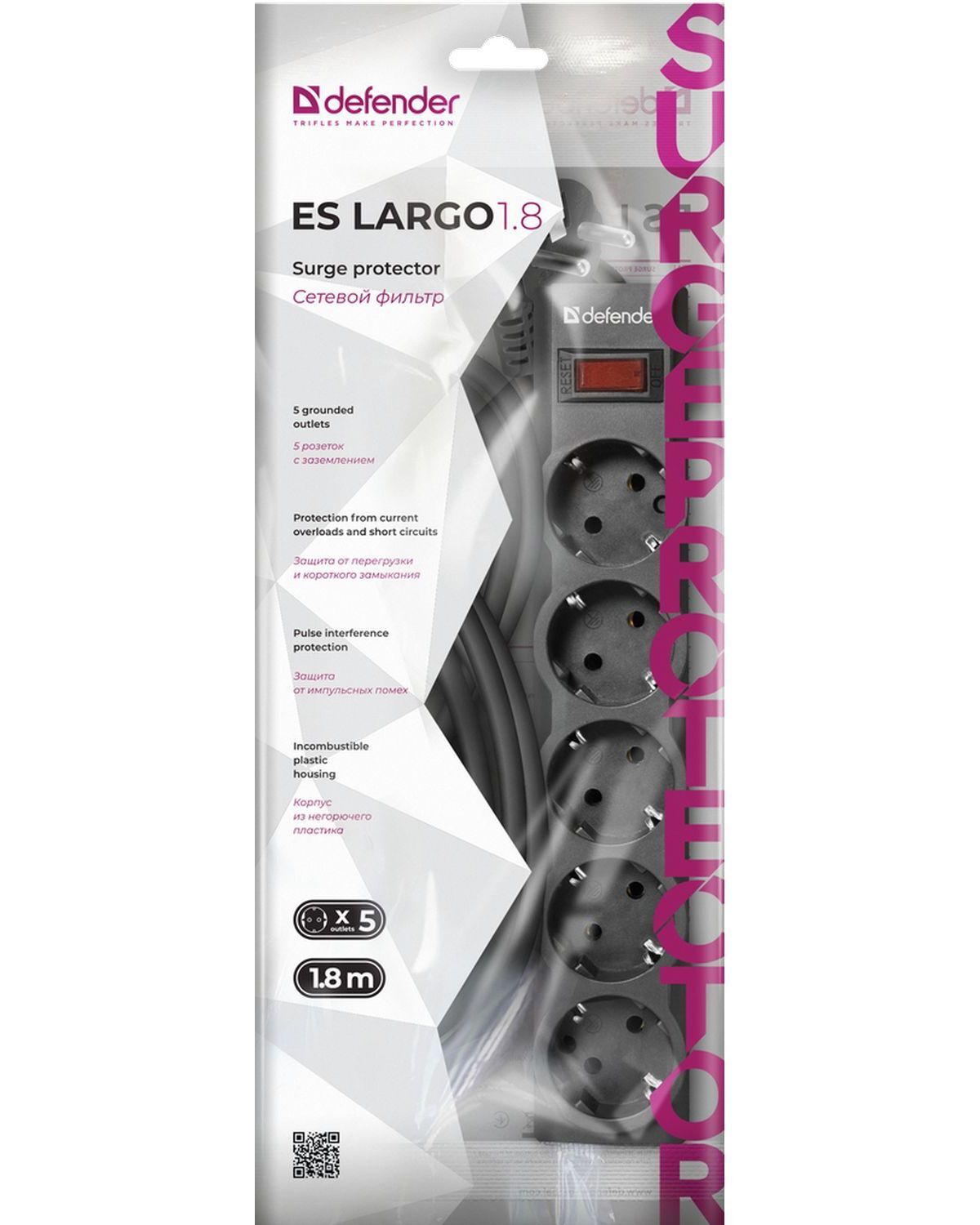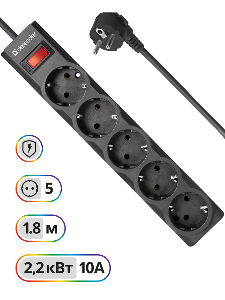 Сетевой фильтр-удлинитель Defender 5 розеток, 1.8 метра , с выключателем, с заземлением, черный
