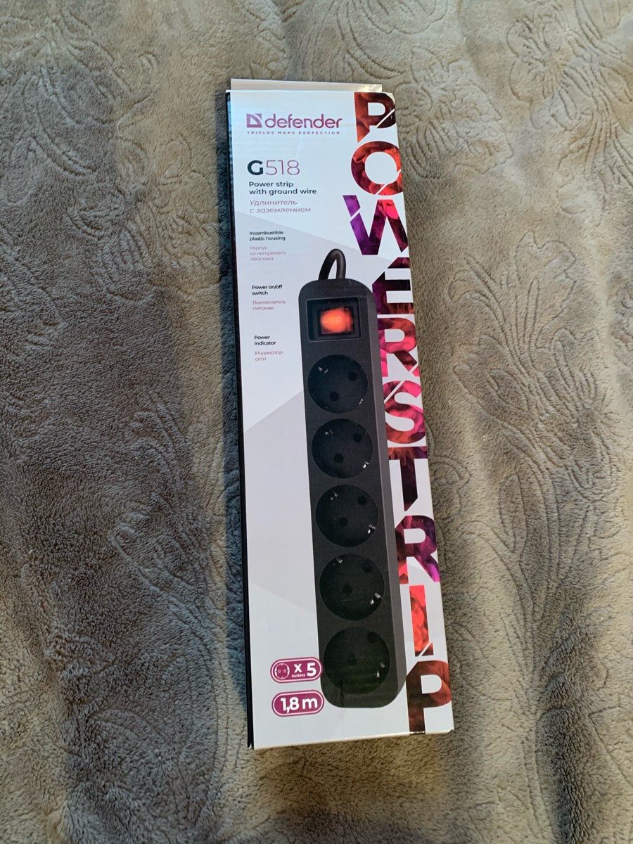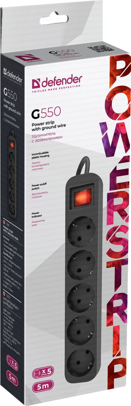 Удлинитель сетевой Defender G550, 5 розеток с заземлением, 5 метров