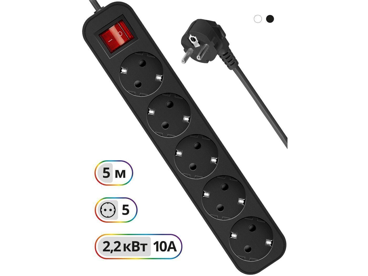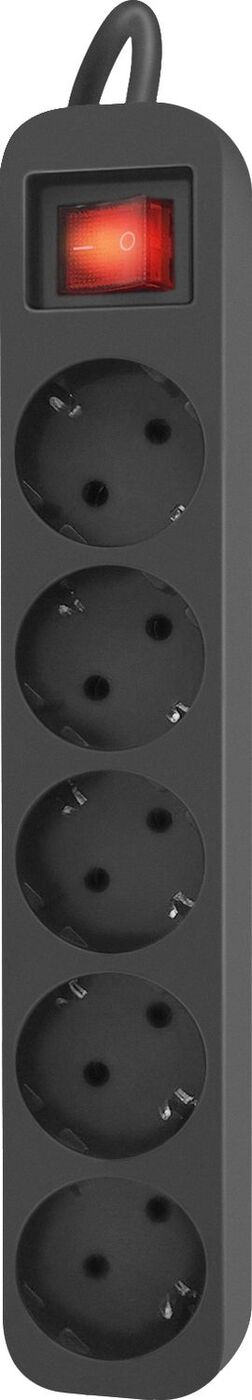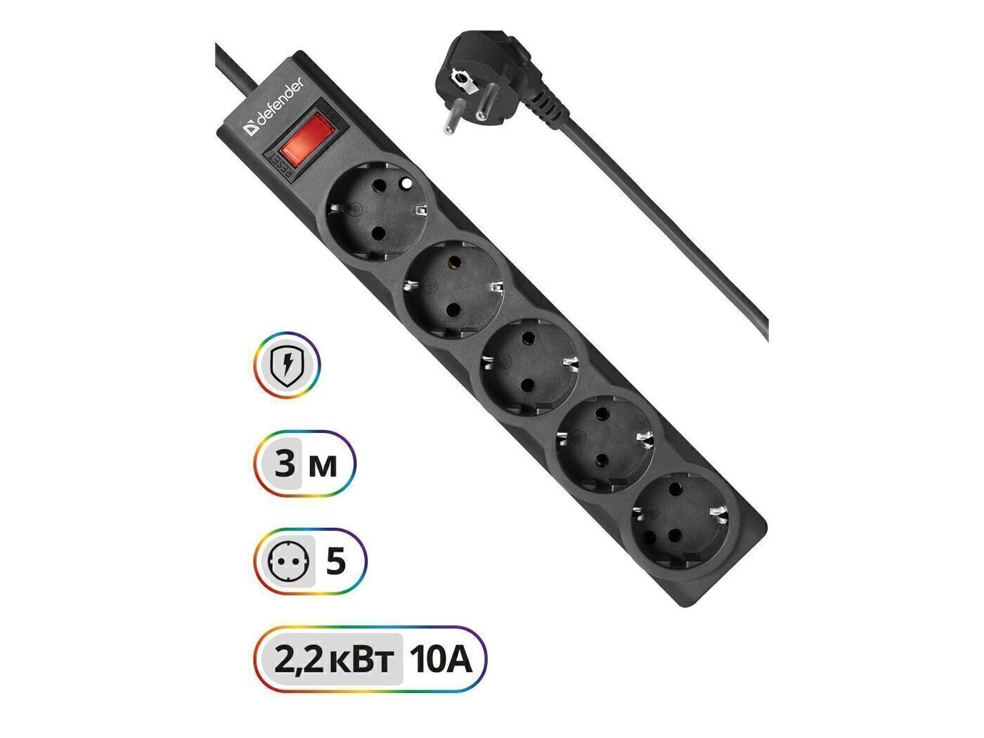 Сетевой фильтр-удлинитель Defender 5 розеток с заземлением, 3 метра, выключатель, черный