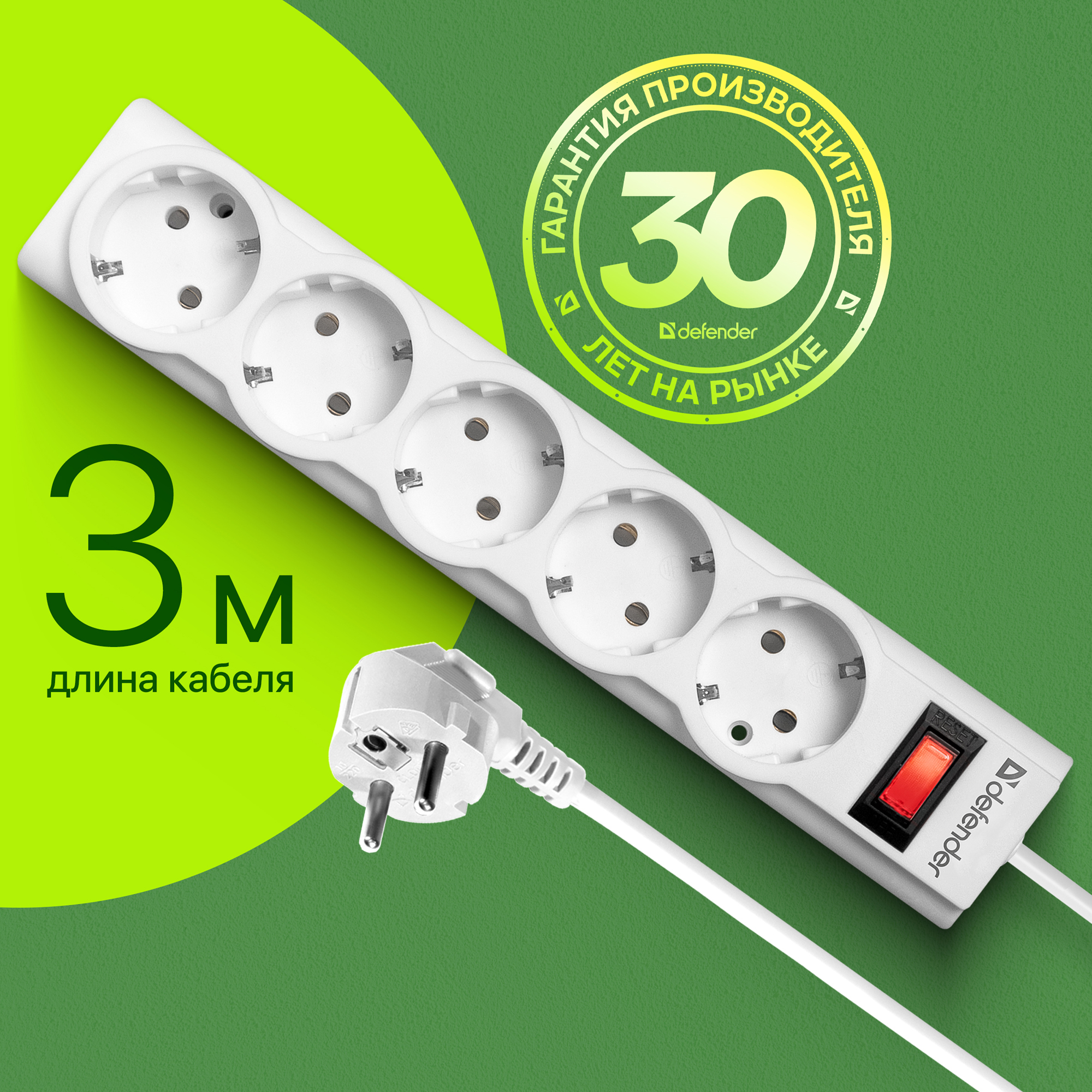 Сетевой фильтр-удлинитель Defender 5 розеток с заземлением , 3 метра , выключатель , белый