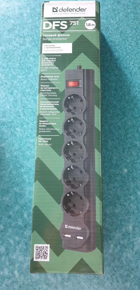 Сетевой фильтр (удлинитель) Defender DFS 755, 5 розеток, 10А, 5 м, черный. Уцененный товар
