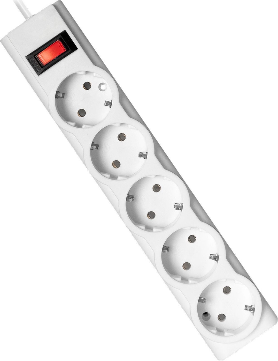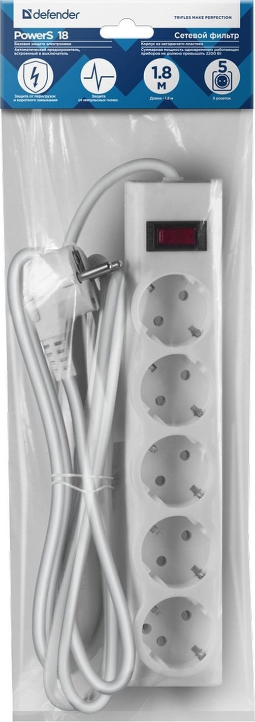 Сетевой фильтр-удлинитель Defender 5 розеток с заземлением, 1,8 метра, выключатель, белый