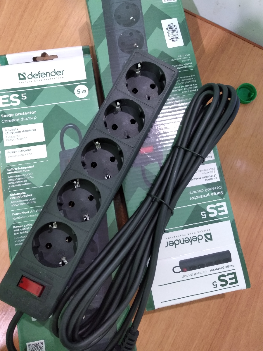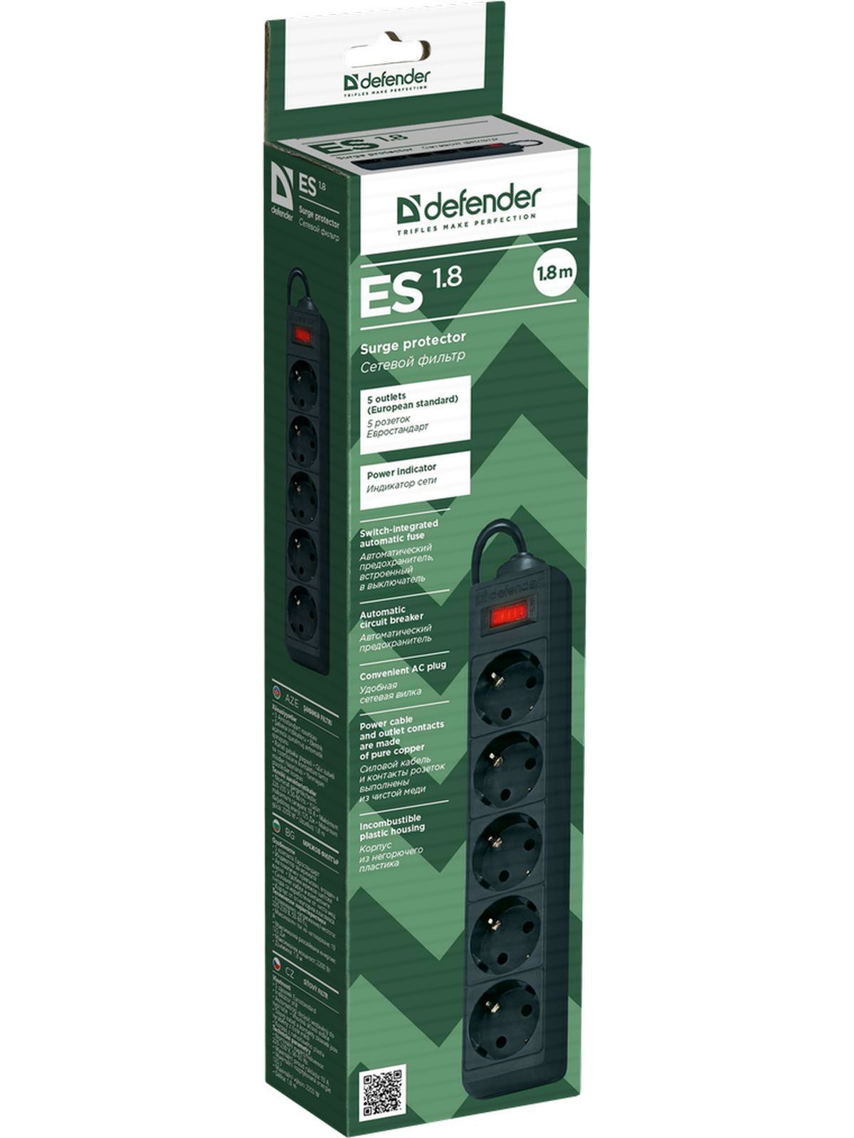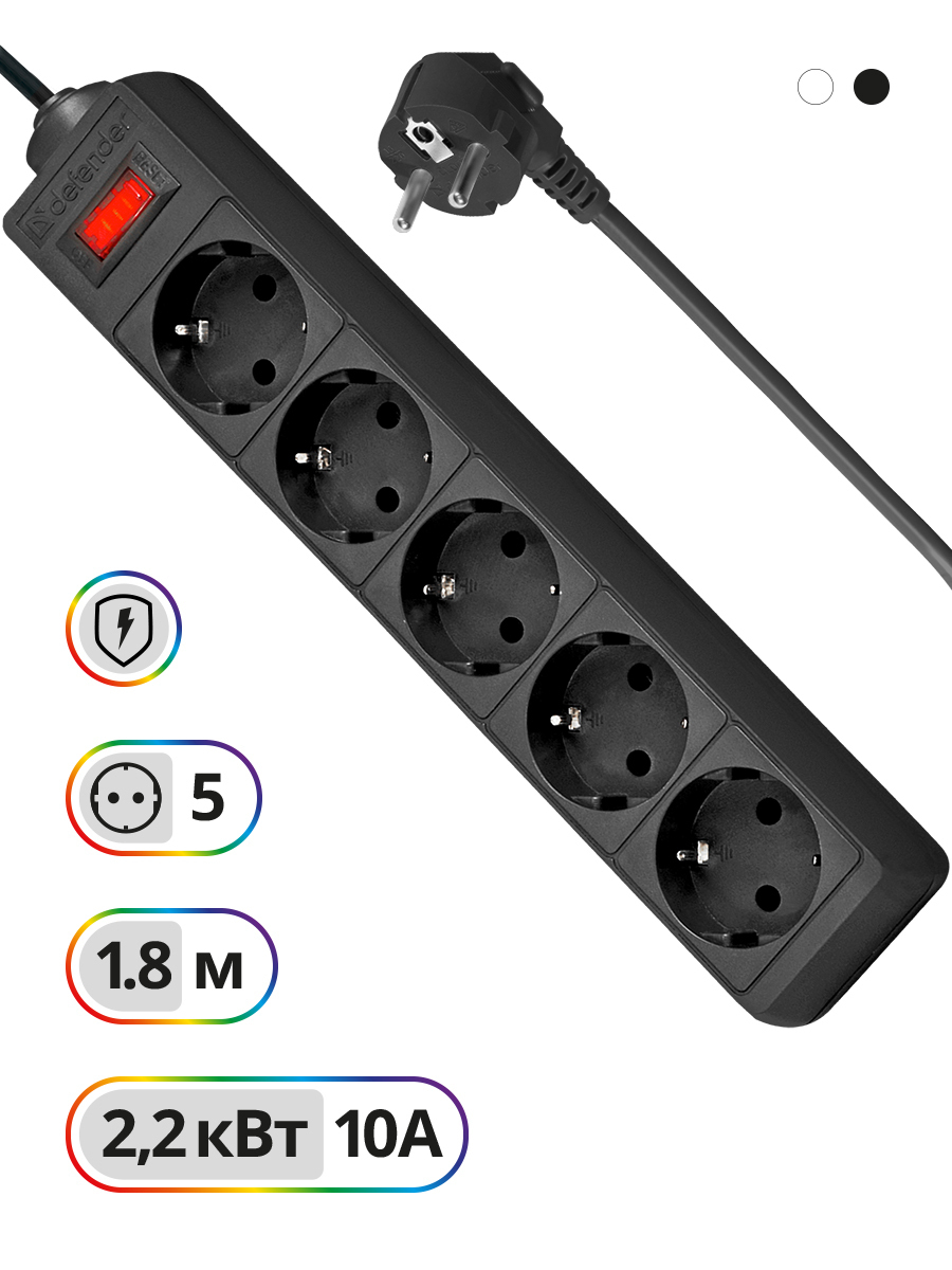 Сетевой фильтр-удлинитель Defender 5 розеток, 1.8 метра, выключатель, с заземлением, черный