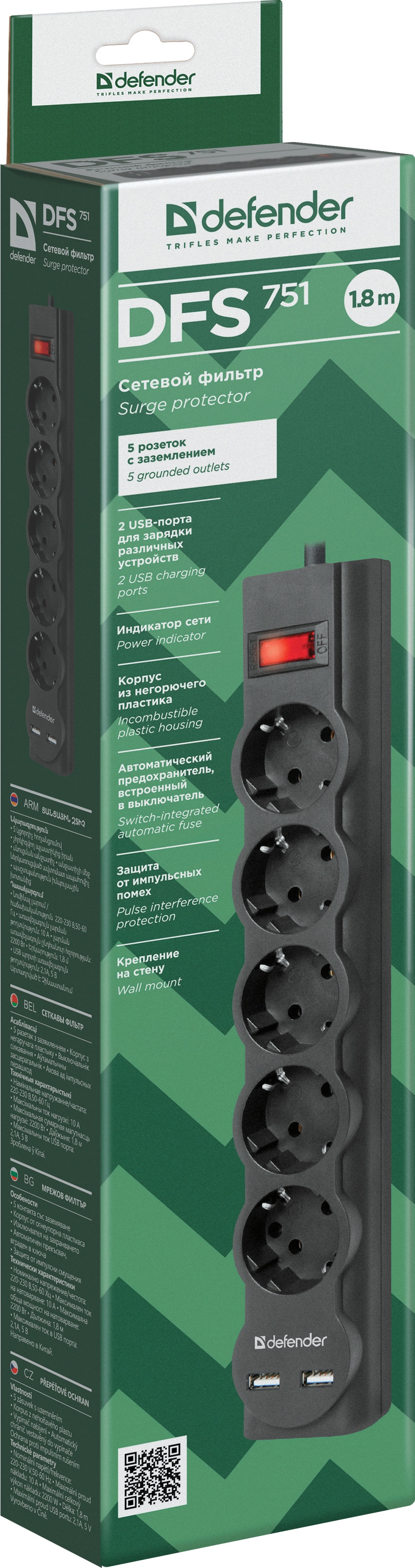 Сетевой фильтр-удлинитель Defender 5 розеток, 1.8 метра , с выключателем, с заземлением, черный