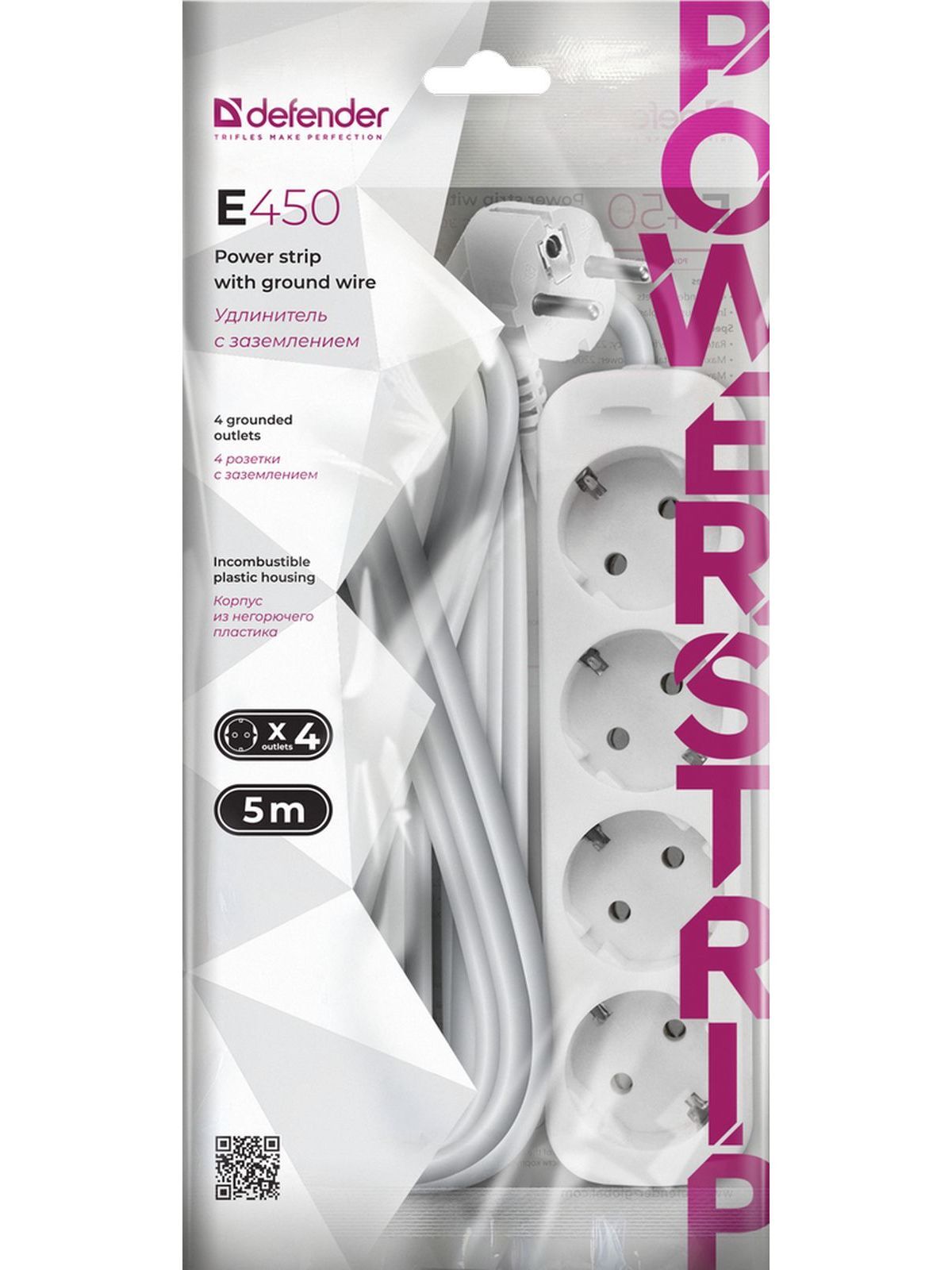 Удлинитель сетевой Defender E450, 4 розетки с заземлением, 5 метров, белый