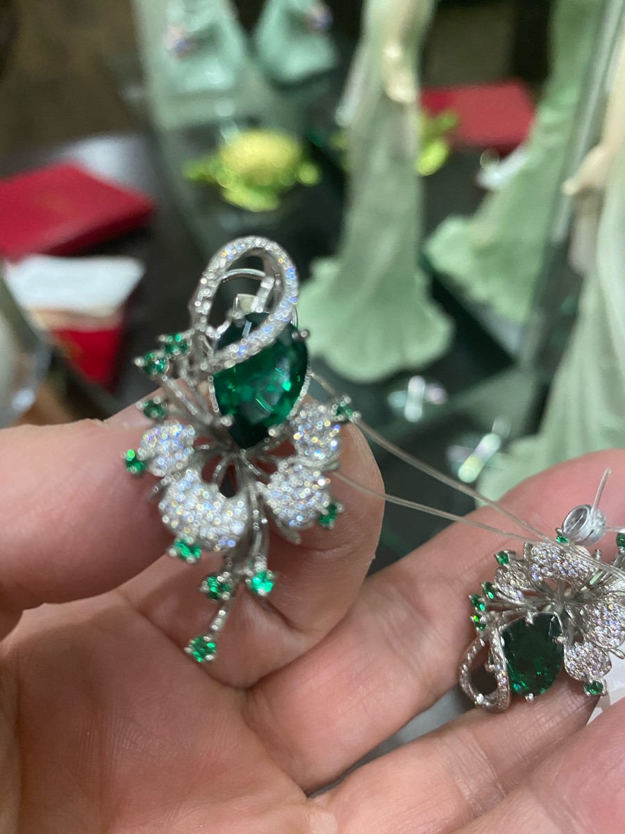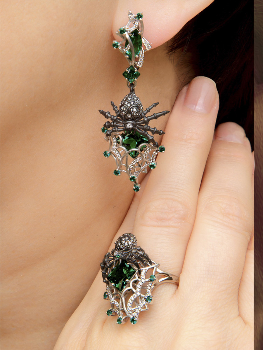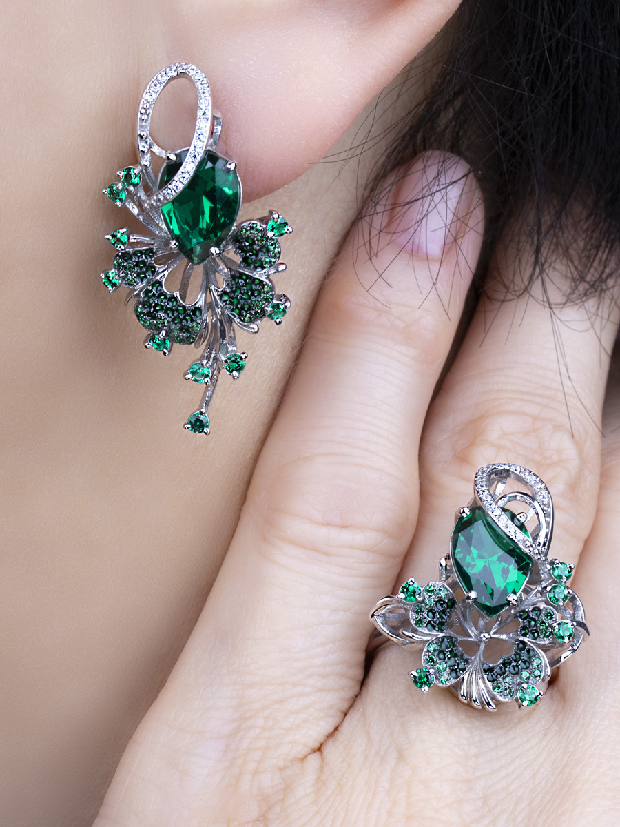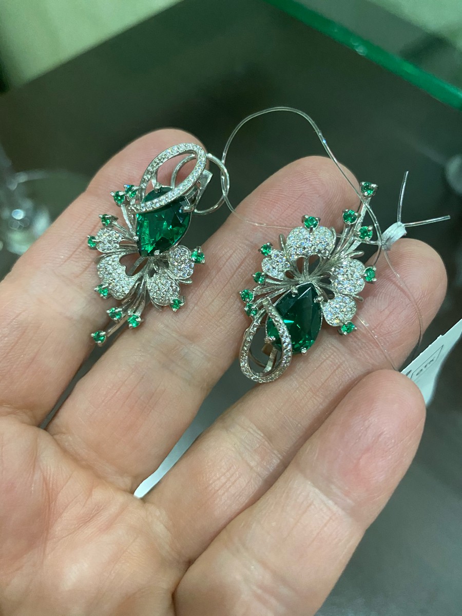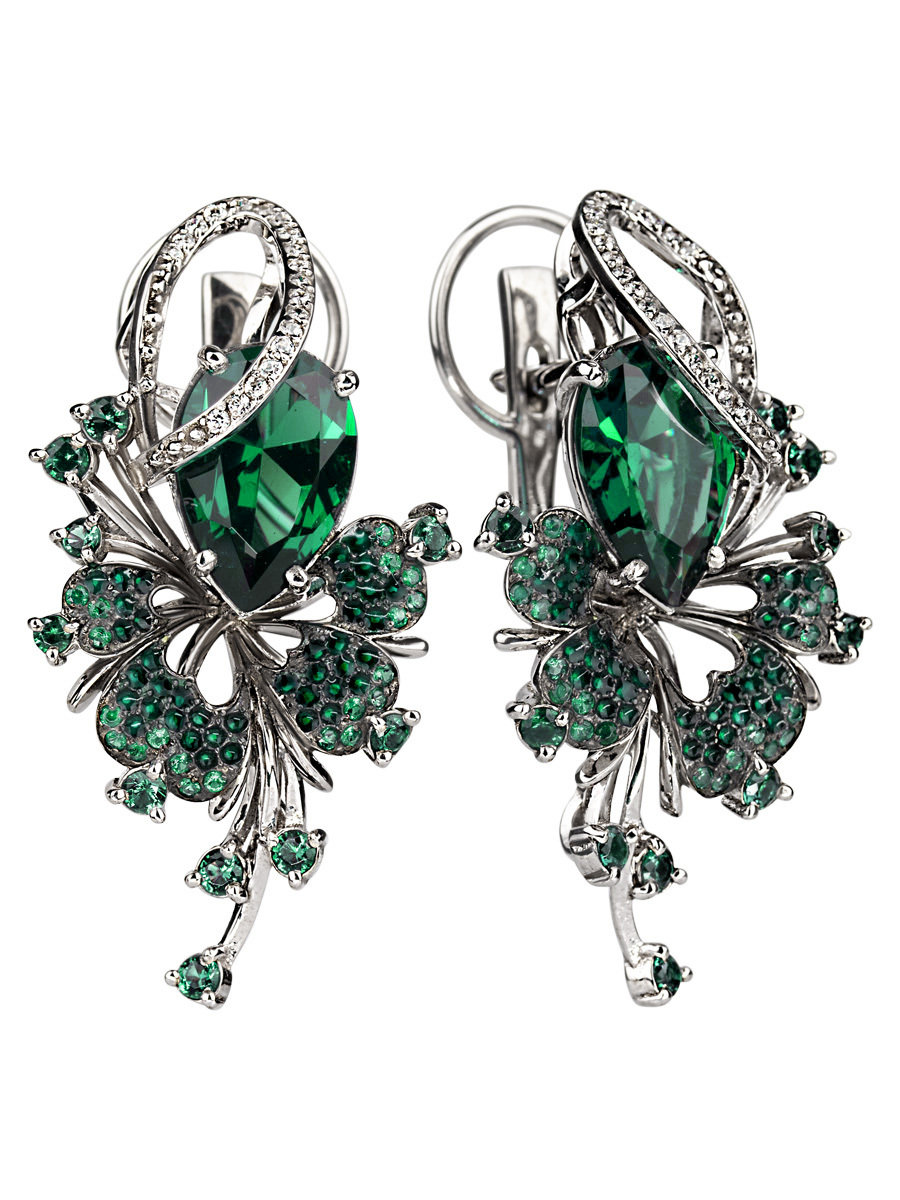 Ди АРС Серьги Паутина тайны из серебра с изумрудом синтетическим и фианитами