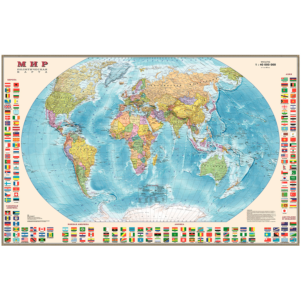 Политическая карта мира с флагами. Масштаб: 1:40М. Мелованная бумага. ДИЭМБИ. В картонном ЭКО тубусе. Размер: 90х58 см.