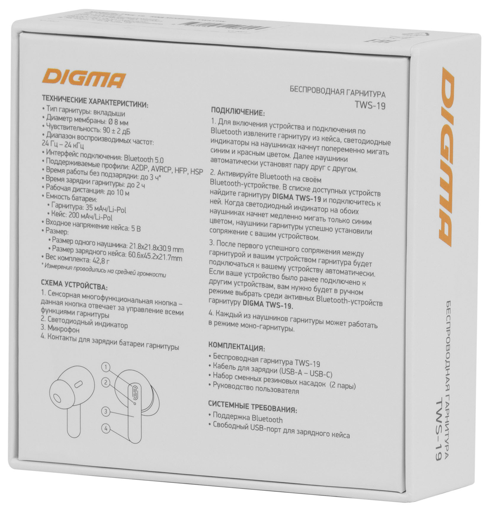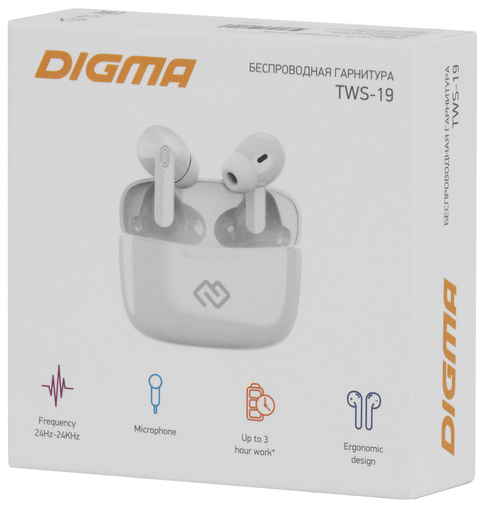 Беспроводные сенсорные наушники с микрофоном bluetooth Digma TWS-19 белые (TWS19W). Уцененный товар