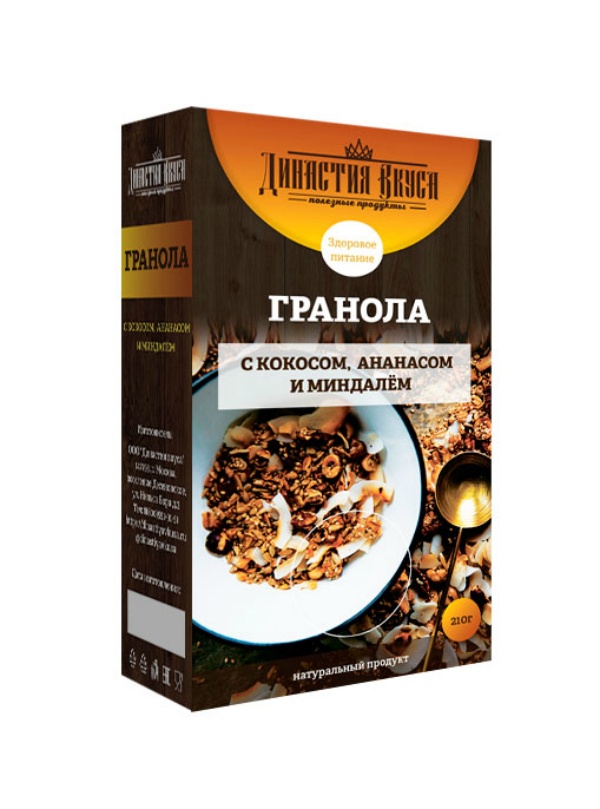 Гранола Династия вкуса со спирулиной, кешью и грушей, коробка