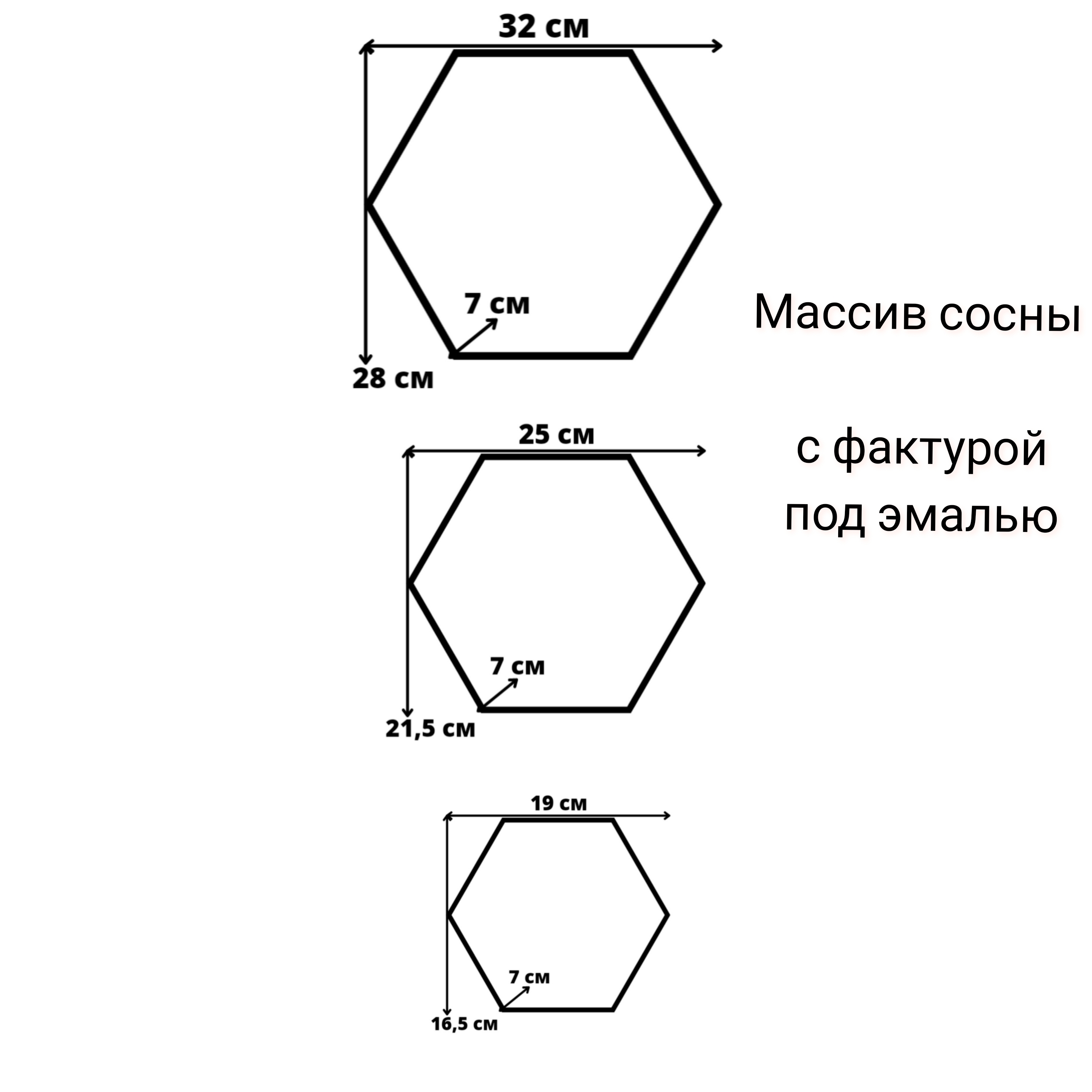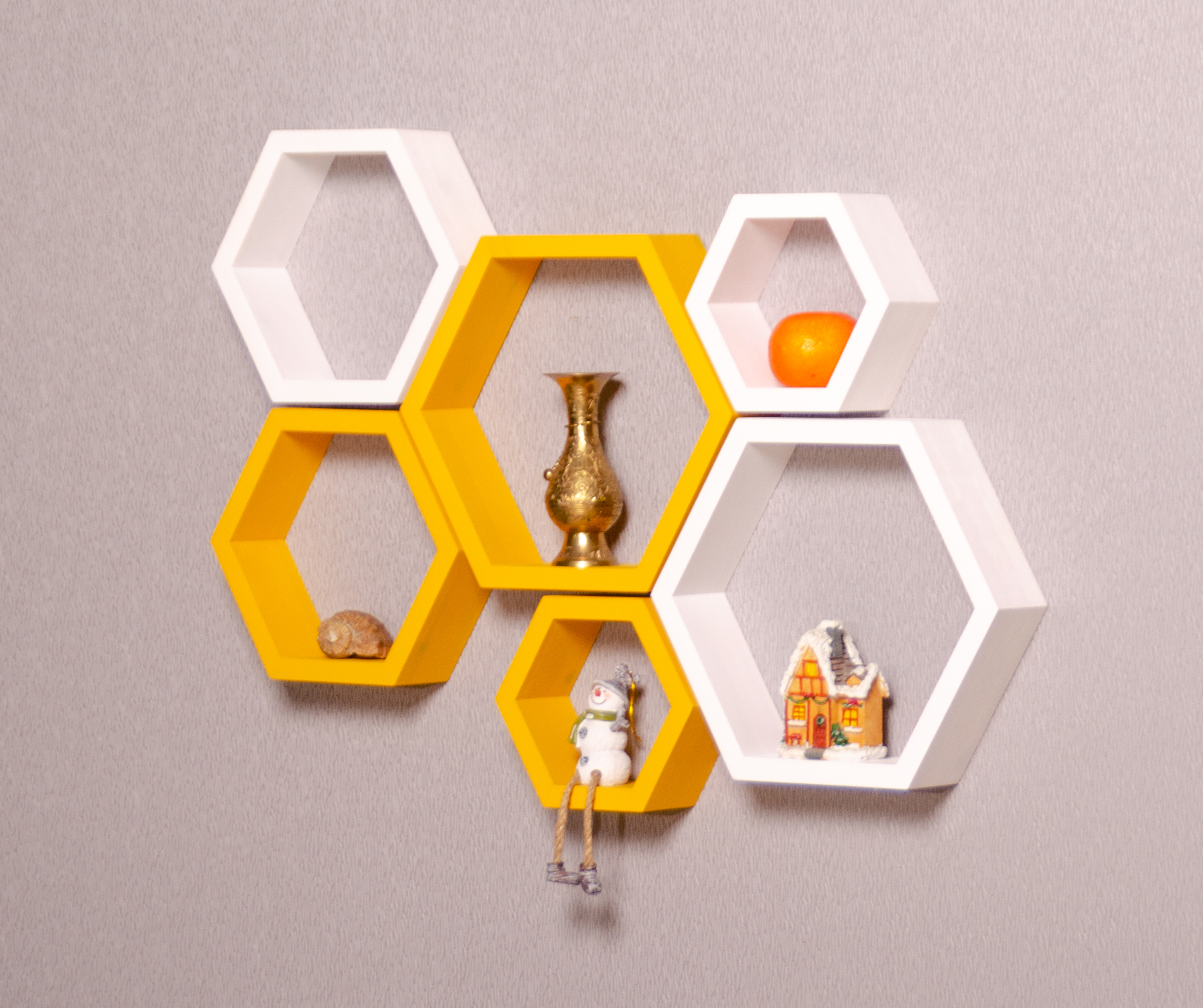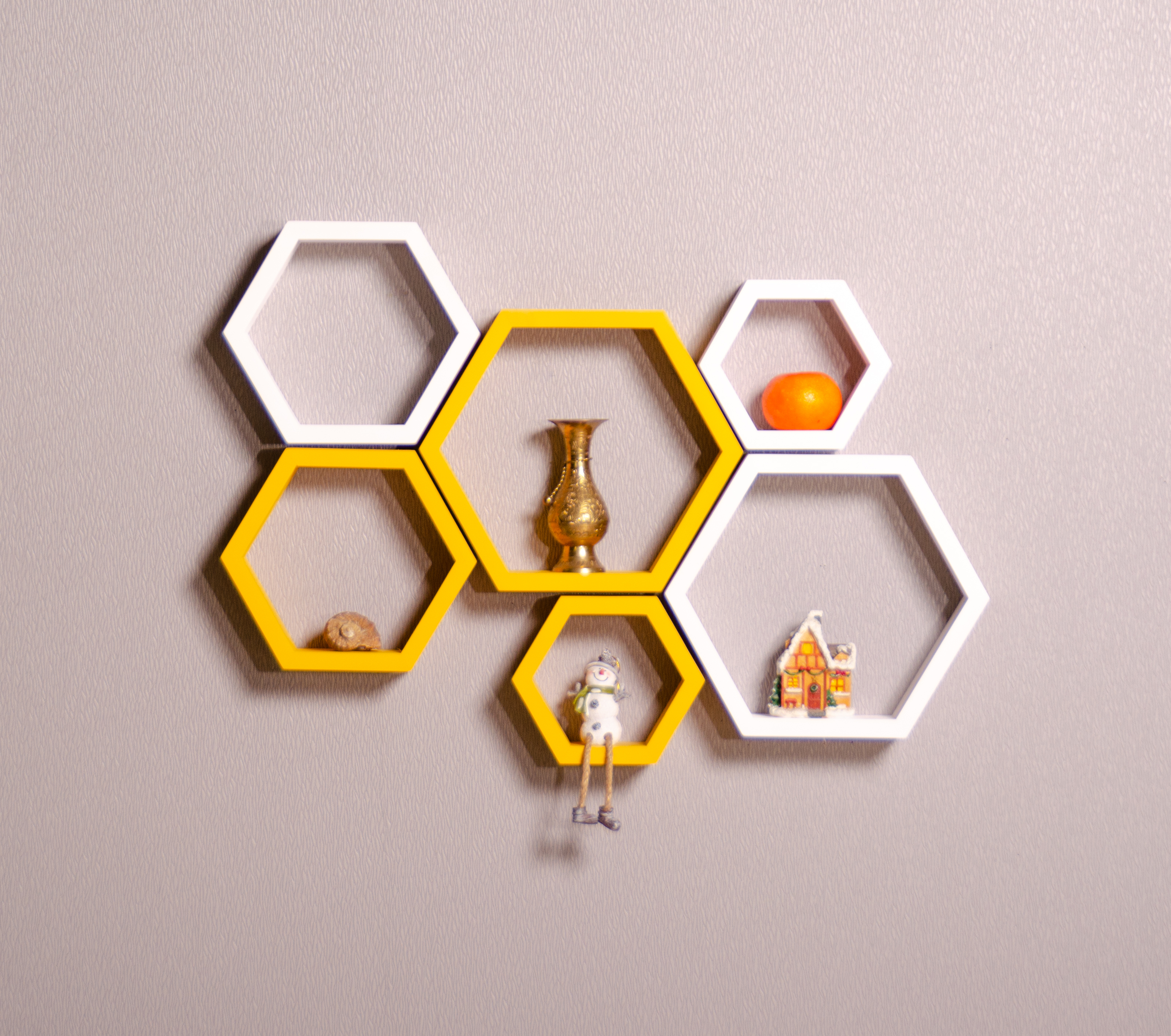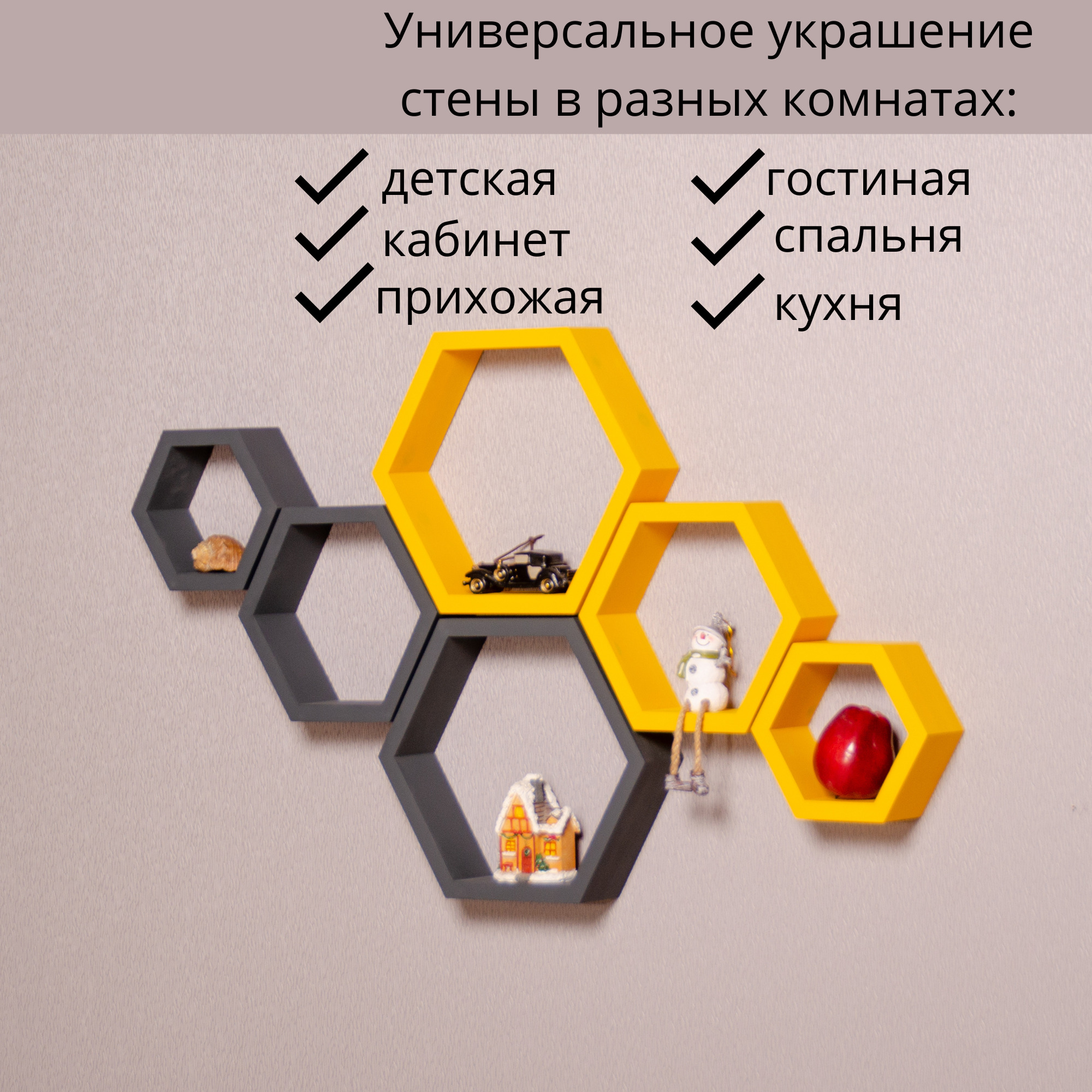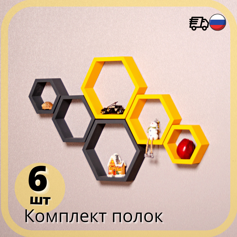 Полка настенная Прямая, Комплект полок Соты из сосны Жёлтые и Чёрные 6 шт, Навесные полки деревянные