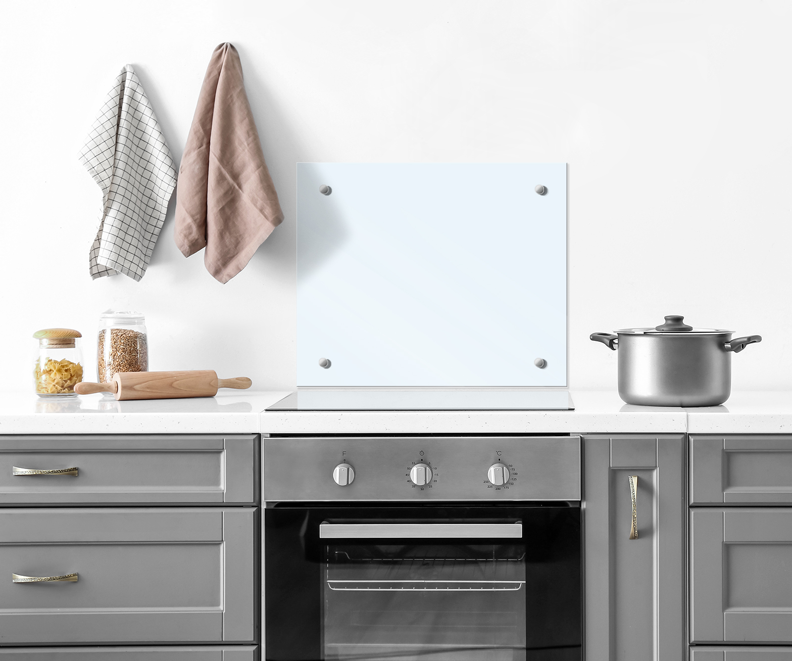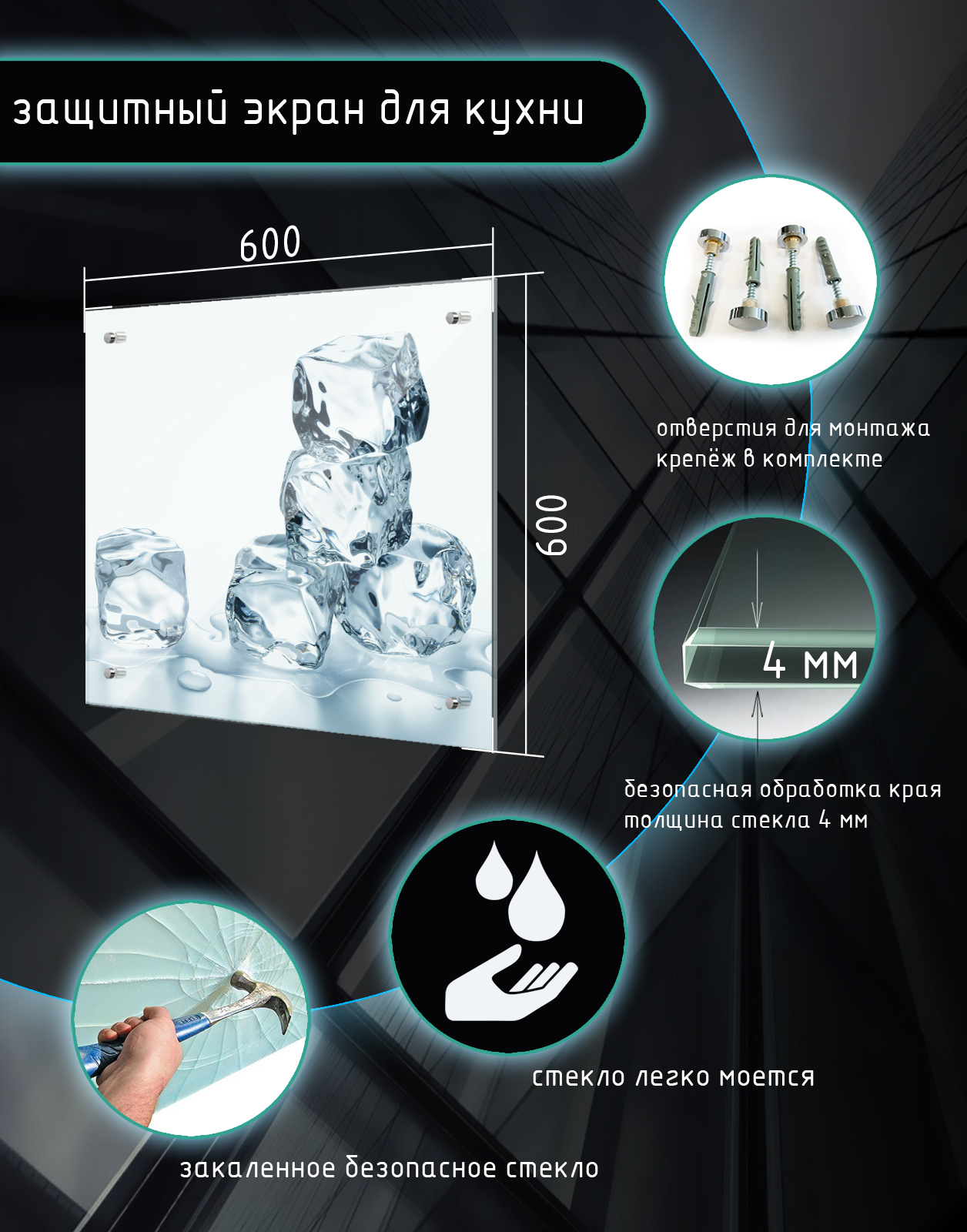 Защитный экран из закаленного стекла на кухонный фартук 600х600х4мм с пленкой