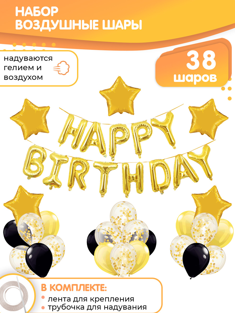 Набор воздушных шаров Happy Birthday на День Рождения, 38 шариков, золото