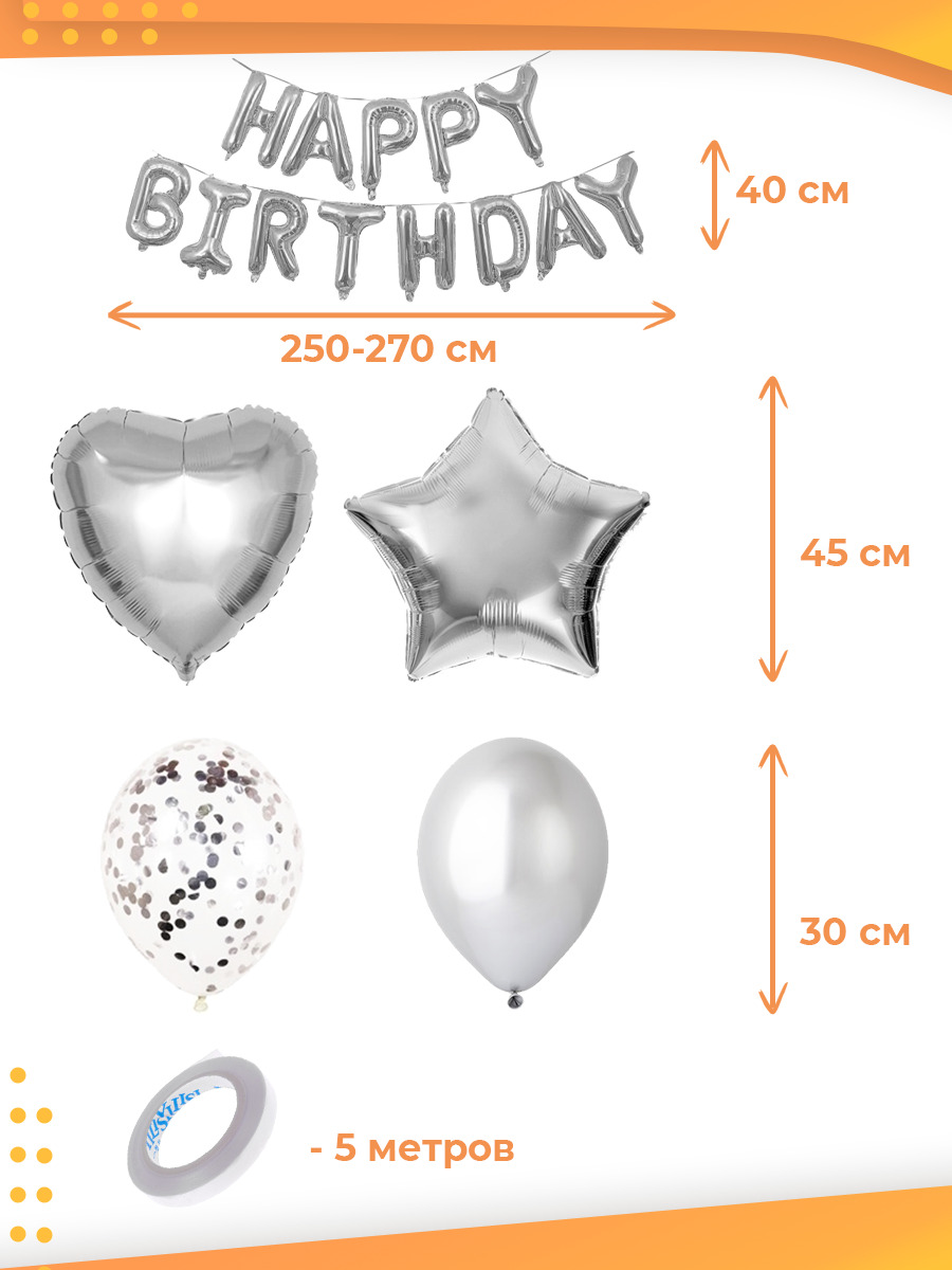 Набор воздушных шаров Happy Birthday на День Рождения, 30 шариков, серебро