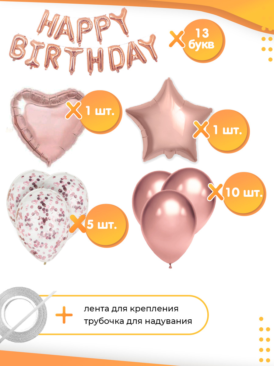 Набор воздушных шаров Happy Birthday на День Рождения, 30 шариков, розовое золото