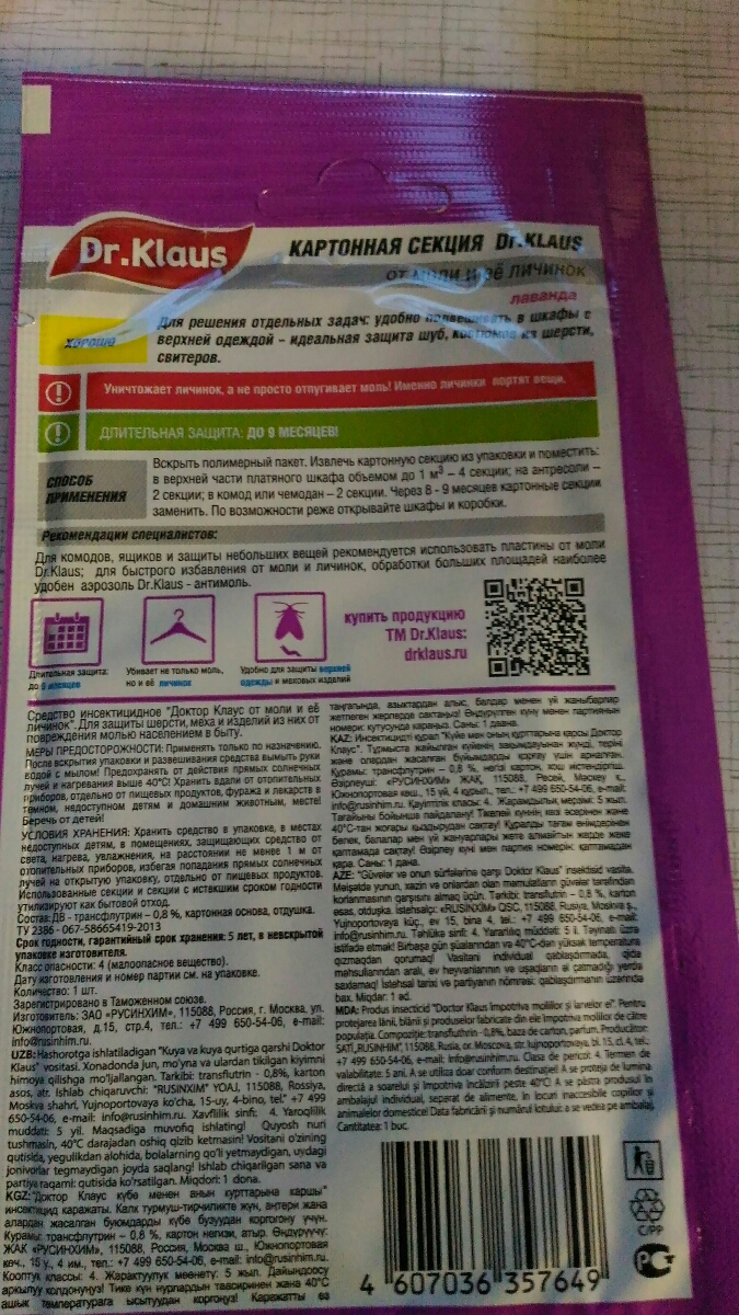 Секция картонная Dr.Klaus от МОЛИ лаванда, в пакете 1 шт.