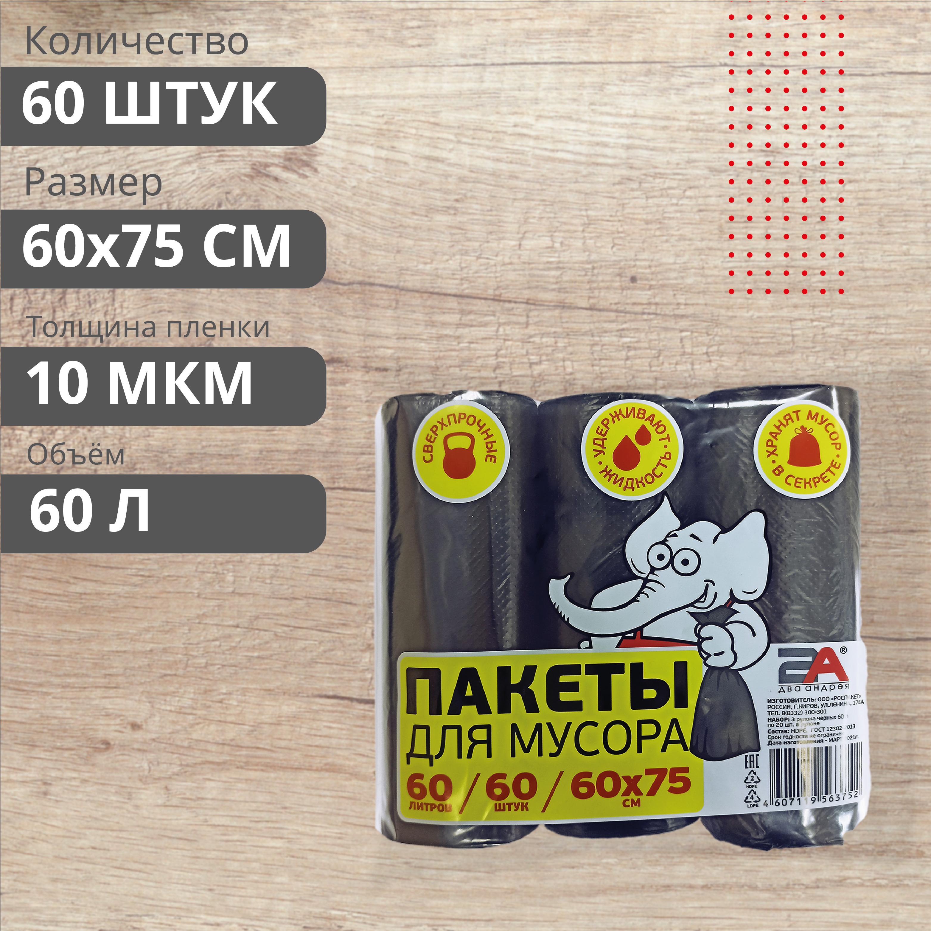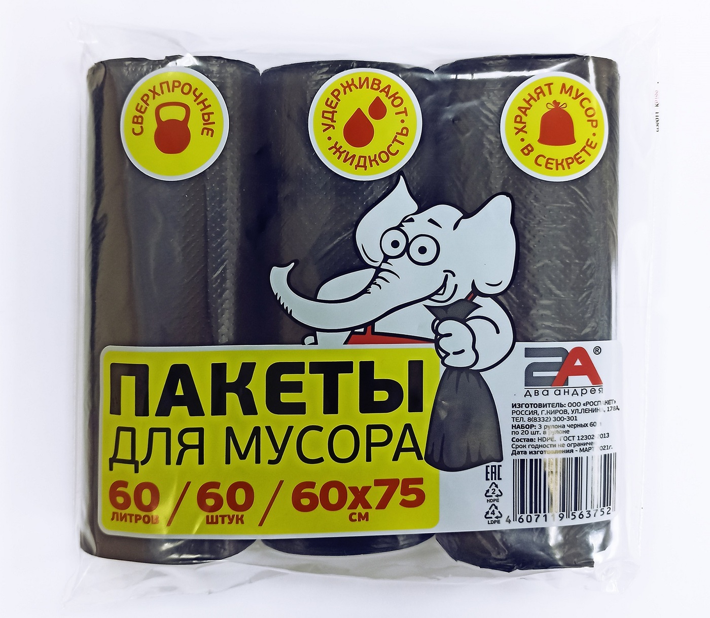 Мешки для мусора Два Андрея 60 л, 60 шт х 3 рул (60 уп)