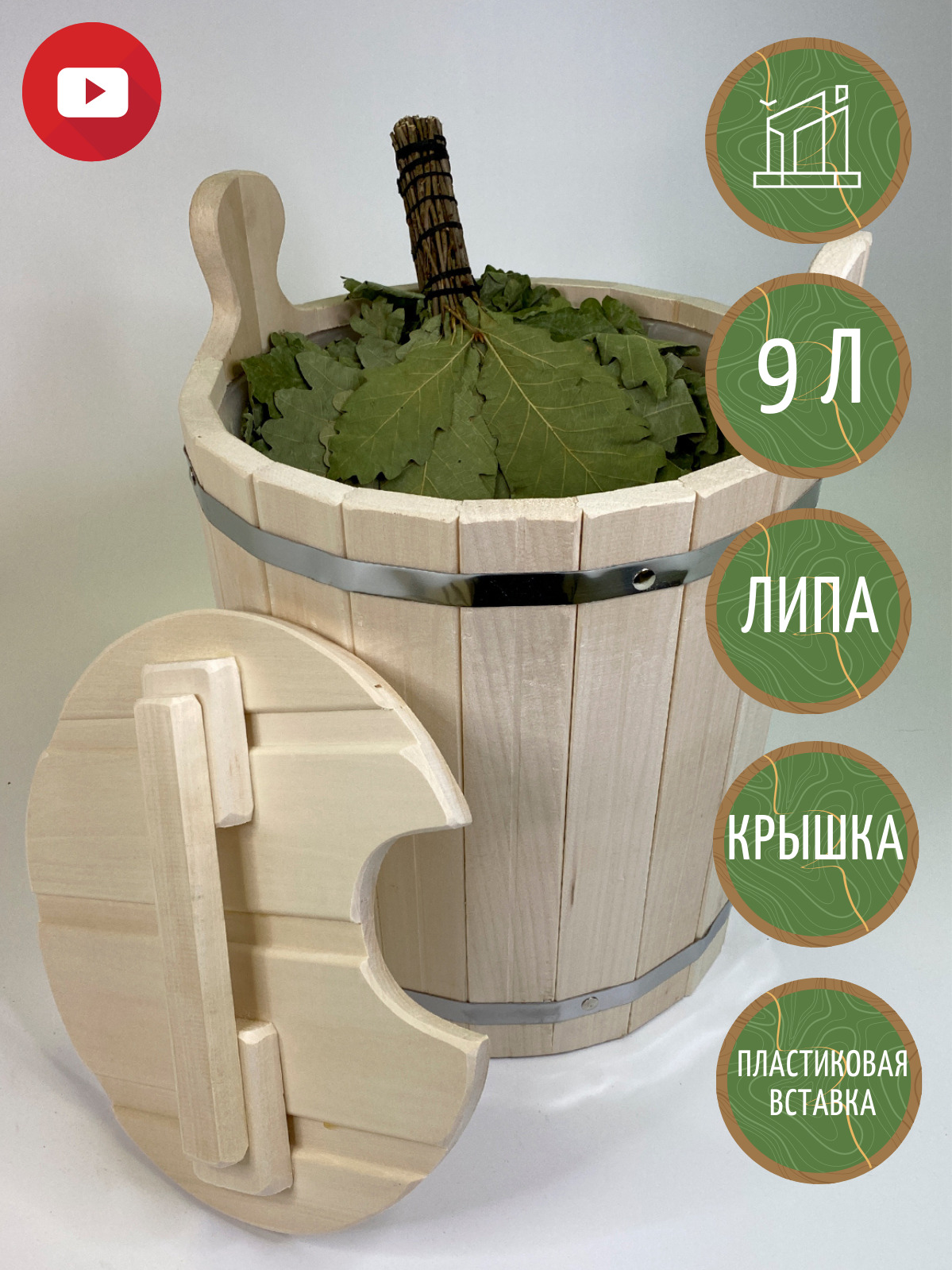 Запарник для бани с крышкой, из липы, 9 литров, ДваДома DBB0021-K, с пластиковой вставкой