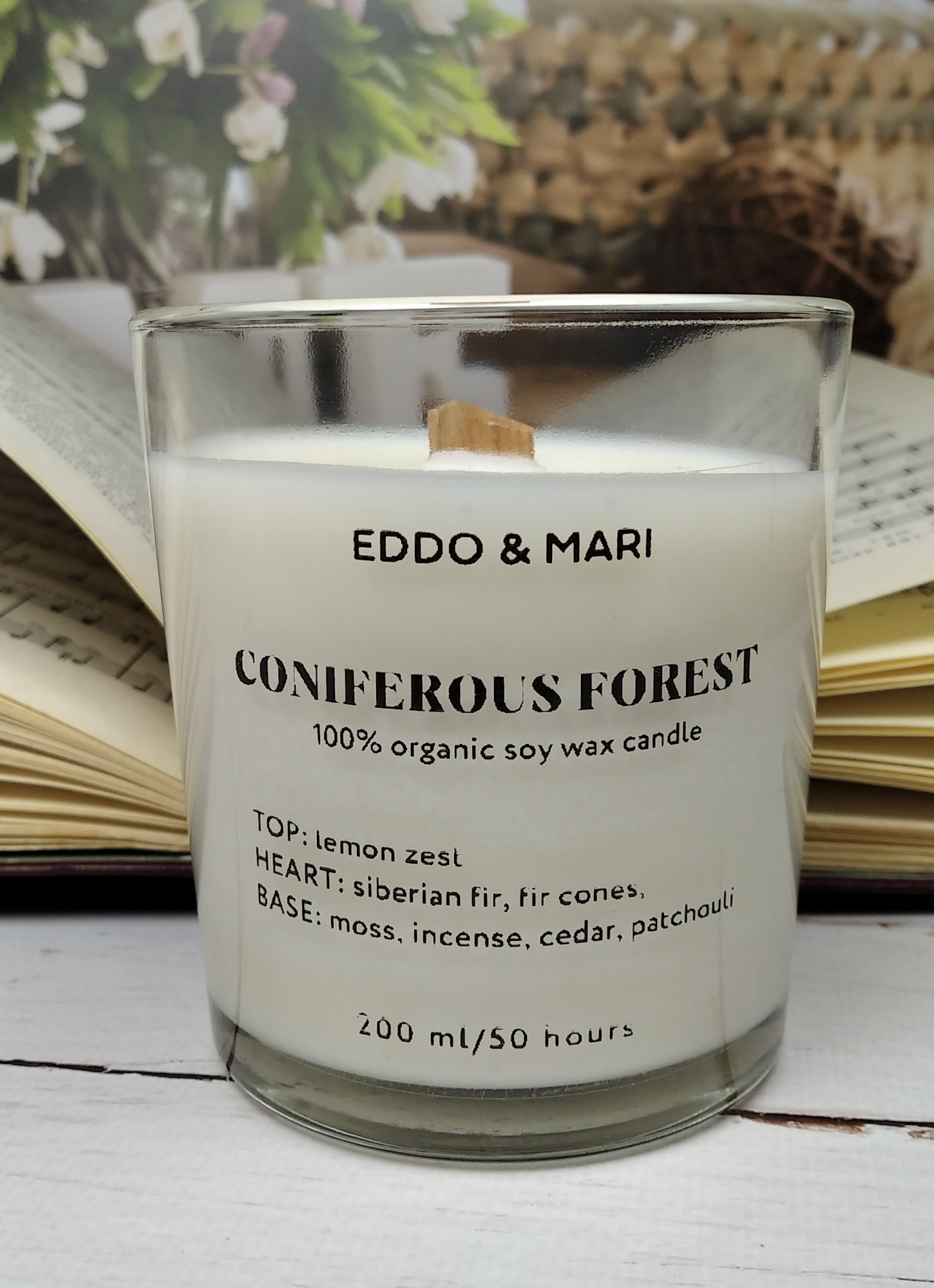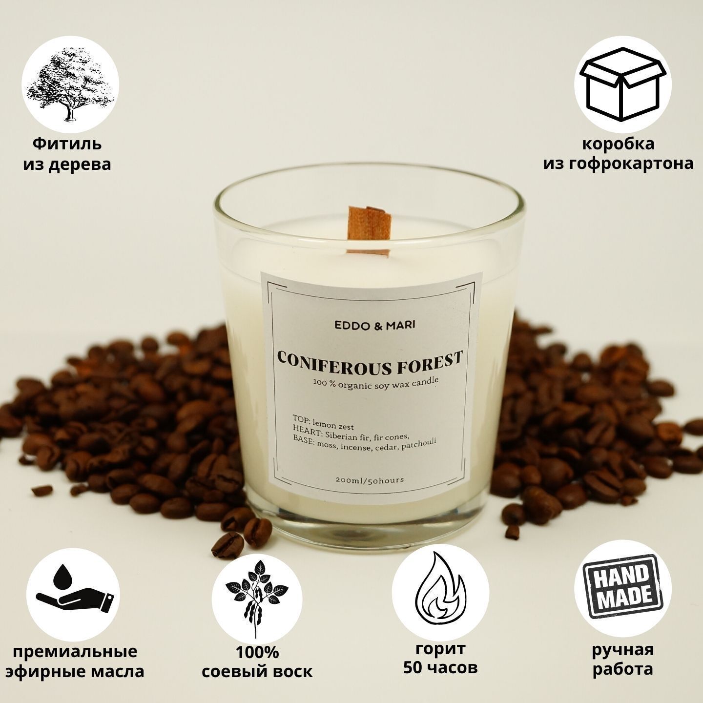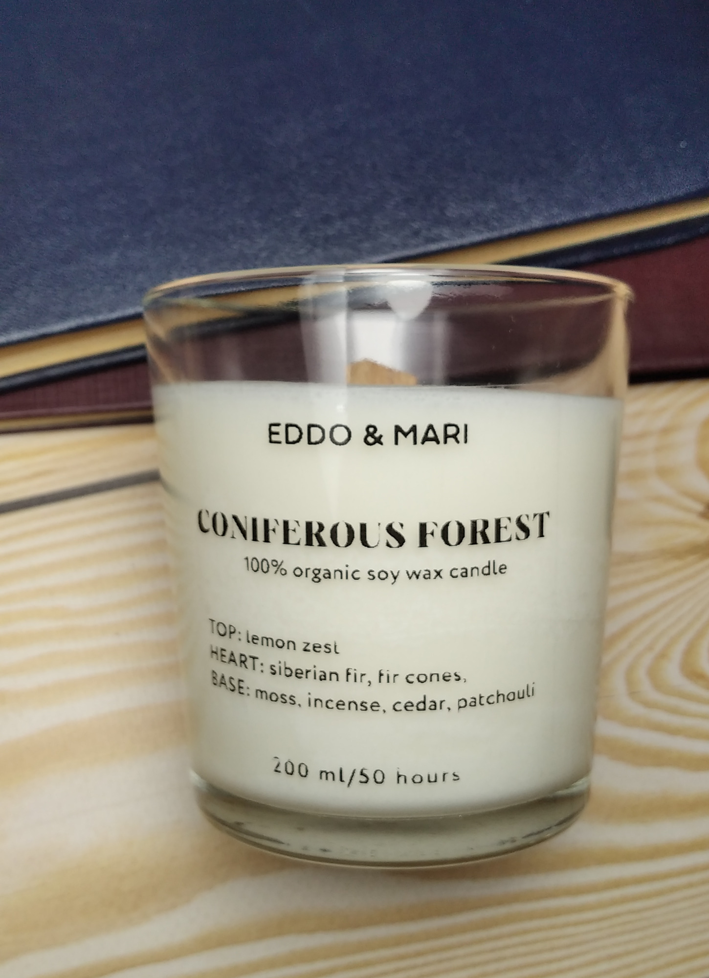 Свеча ароматическая EDDO&MARI "Хвойный лес"/ в стакане / интерьерная/ 50 часов горения/ древесный фитиль, 1 шт