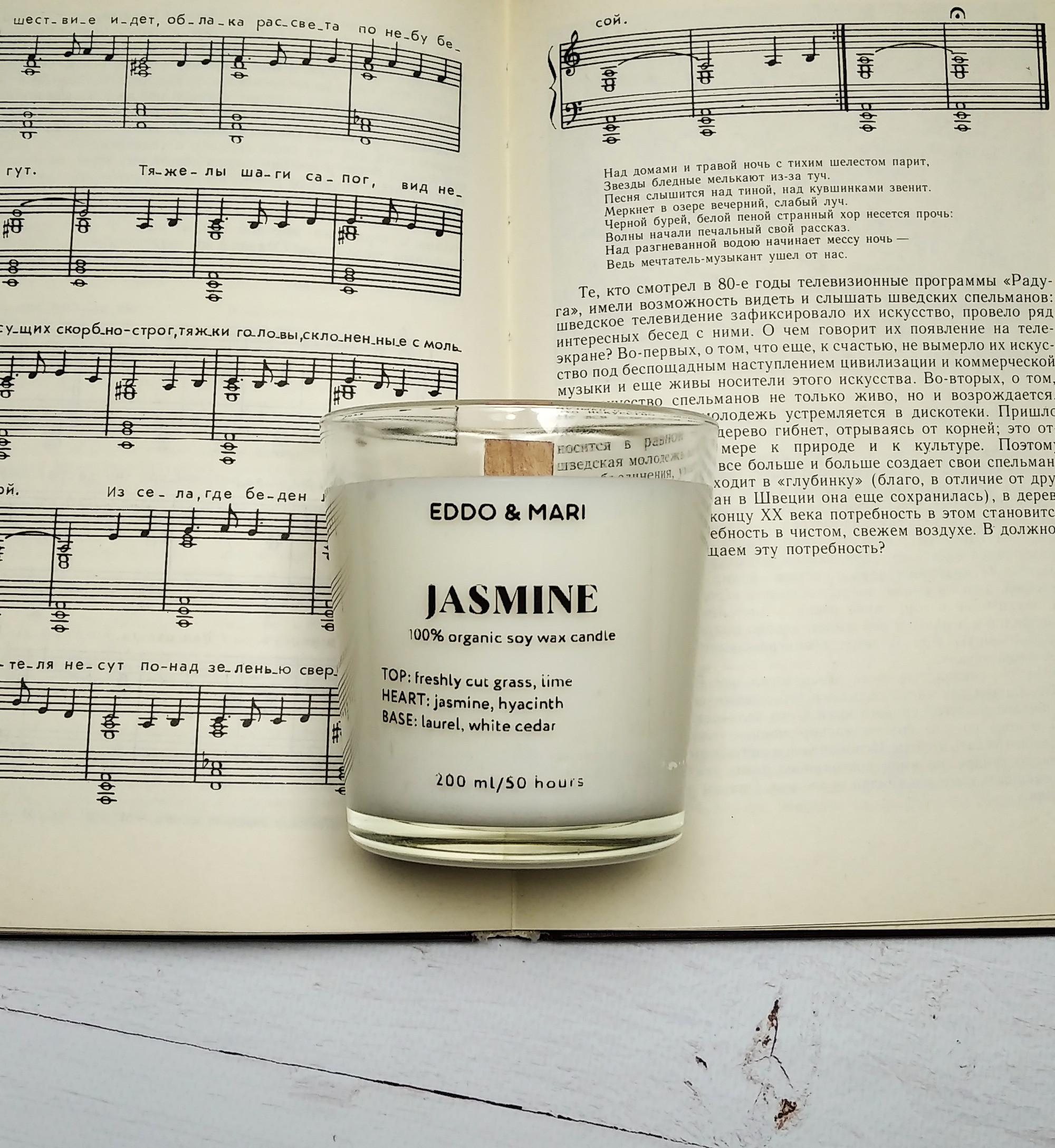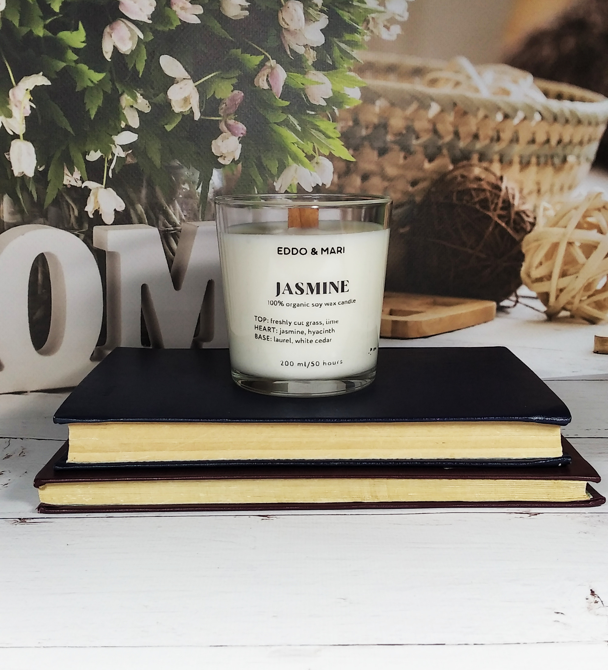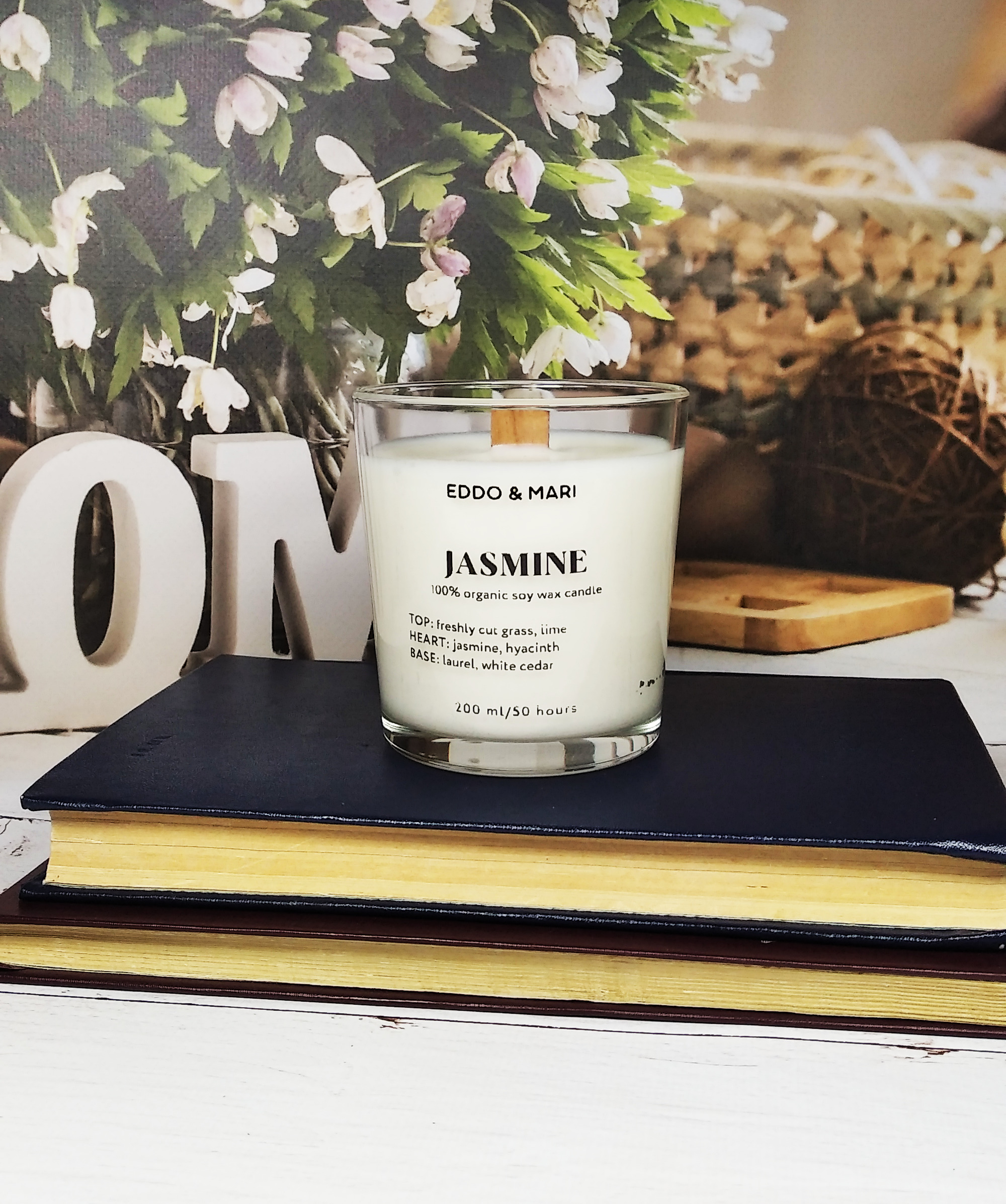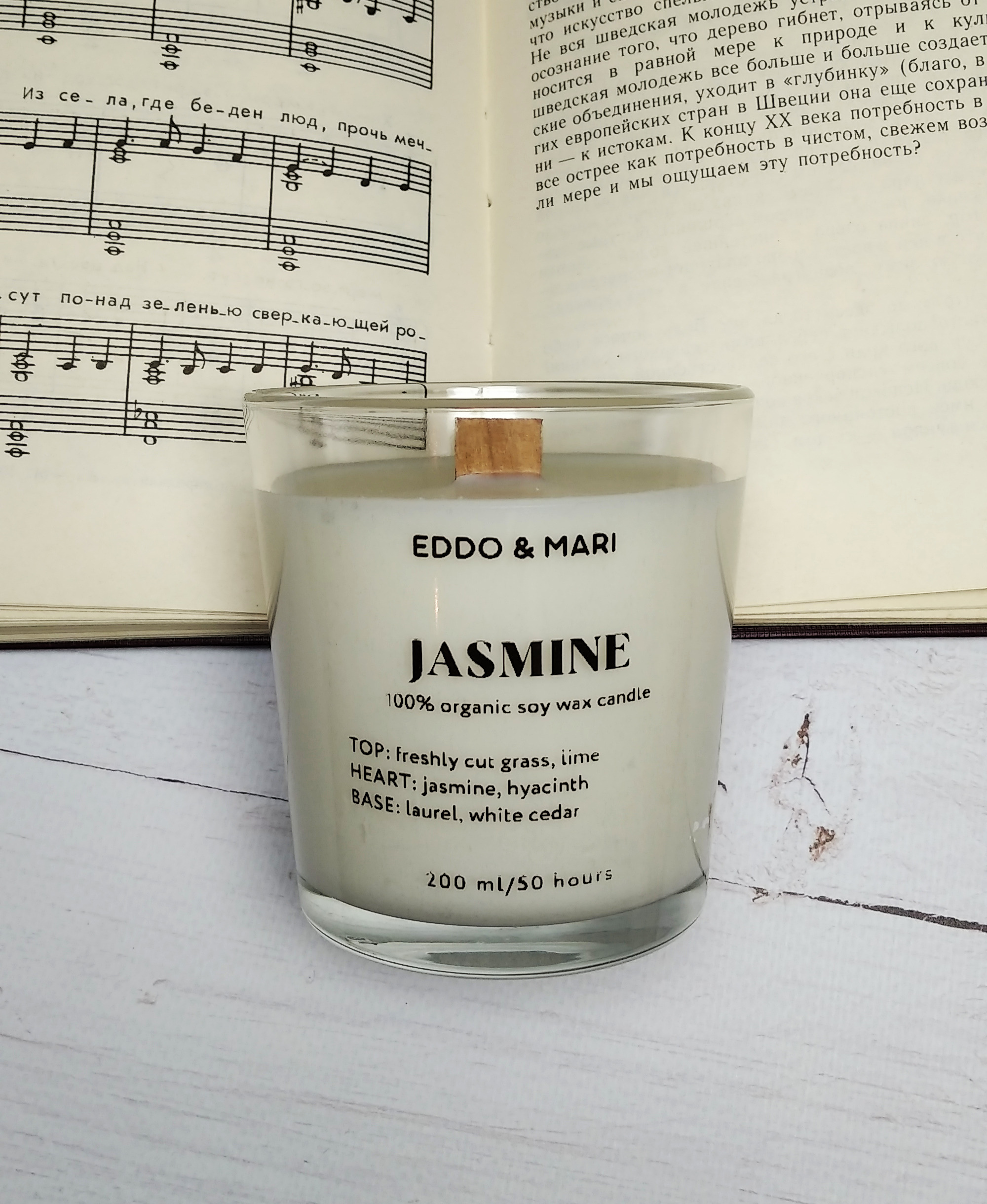 Свеча ароматическая EDDO&MARI "Жасмин"/ в стакане / интерьерная/ 50 часов горения/ древесный фитиль, 1 шт
