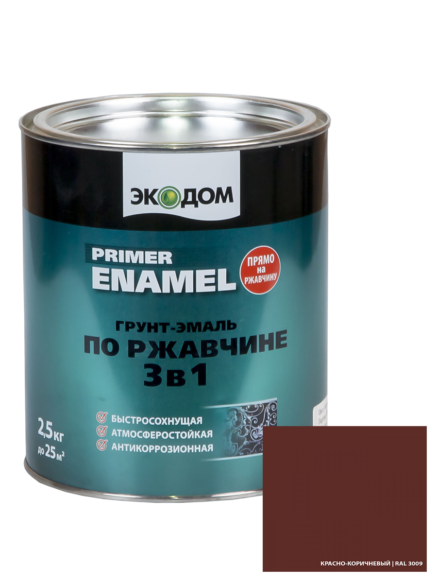 Грунт-эмаль ЭКОДОМ 3 в 1 Быстросохнущая, Полуматовое покрытие, 2.5 кг, коричнево-красный
