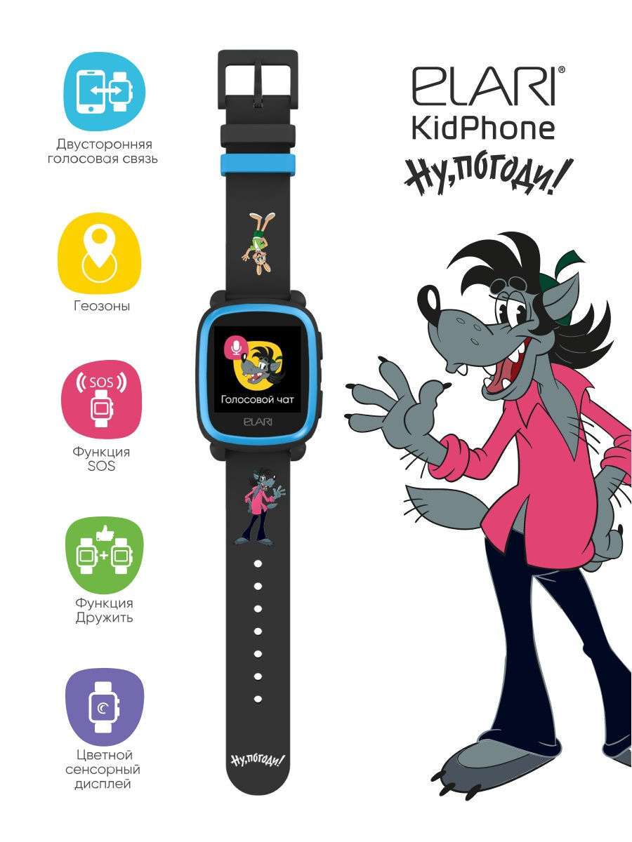 Умные часы для детей ELARI KidPhone «Ну, Погоди!», черный