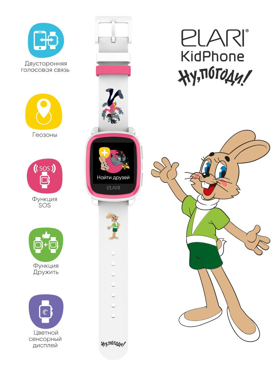 Умные часы для детей ELARI KidPhone «Ну, Погоди!», белый