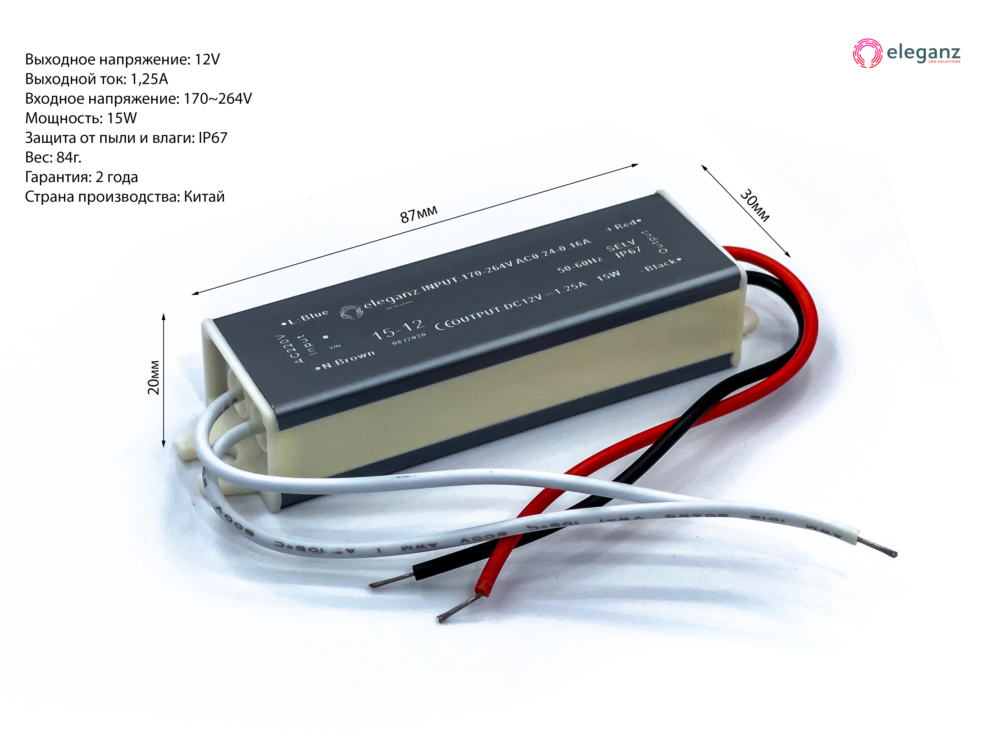 Блок питания для светодиодной ленты, Драйвер для светодиодной ленты Eleganz, 12В, 15 Вт, IP67