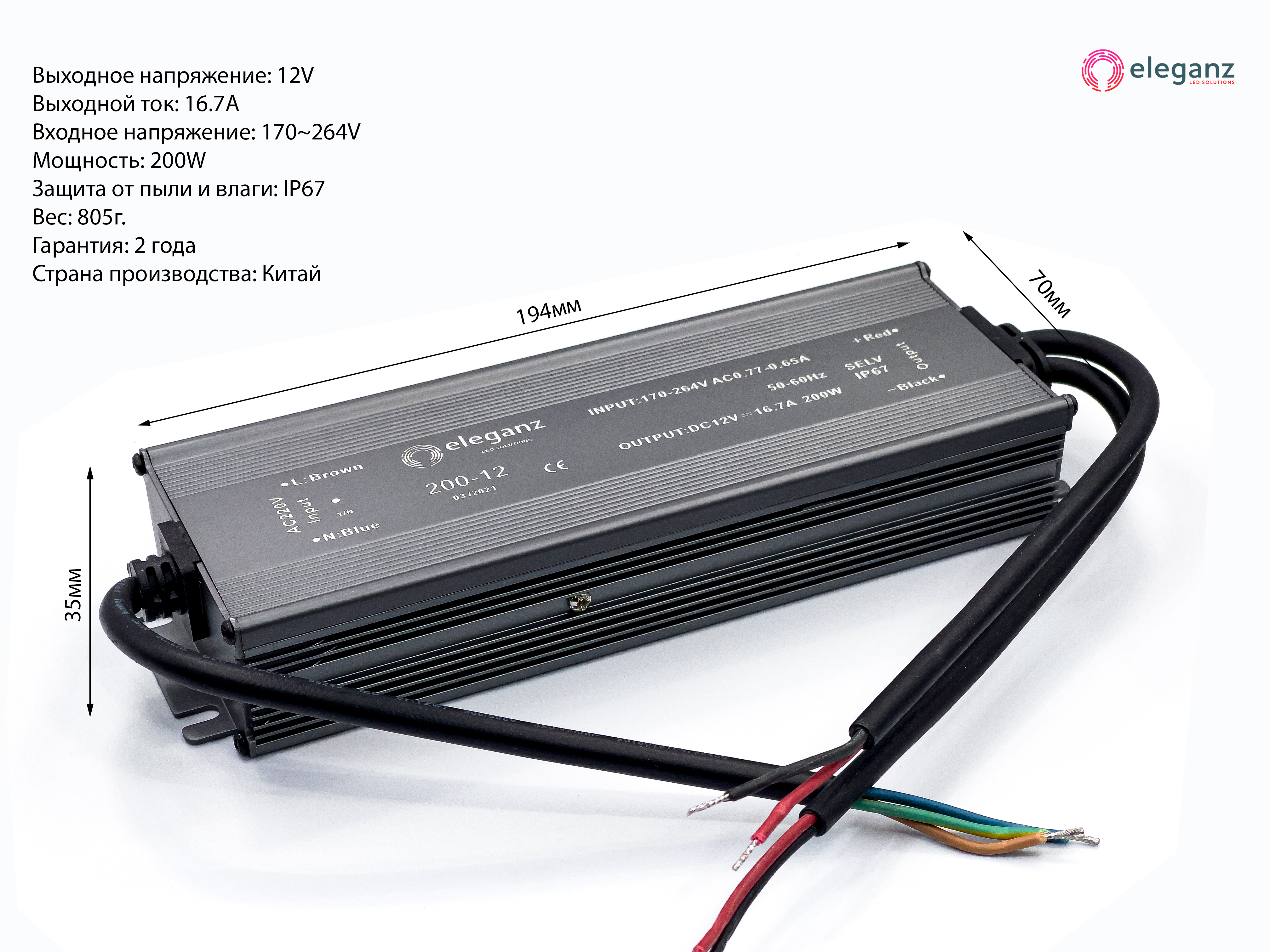 Блок питания для светодиодной ленты, Блок питания для светильника Eleganz, 12В, 200 Вт, IP67
