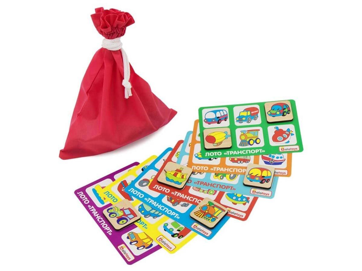 Лото "Транспорт" Развивающие игрушки Настольная игра для детей, 42 деревянные фишки, 7 карточек, мешочек