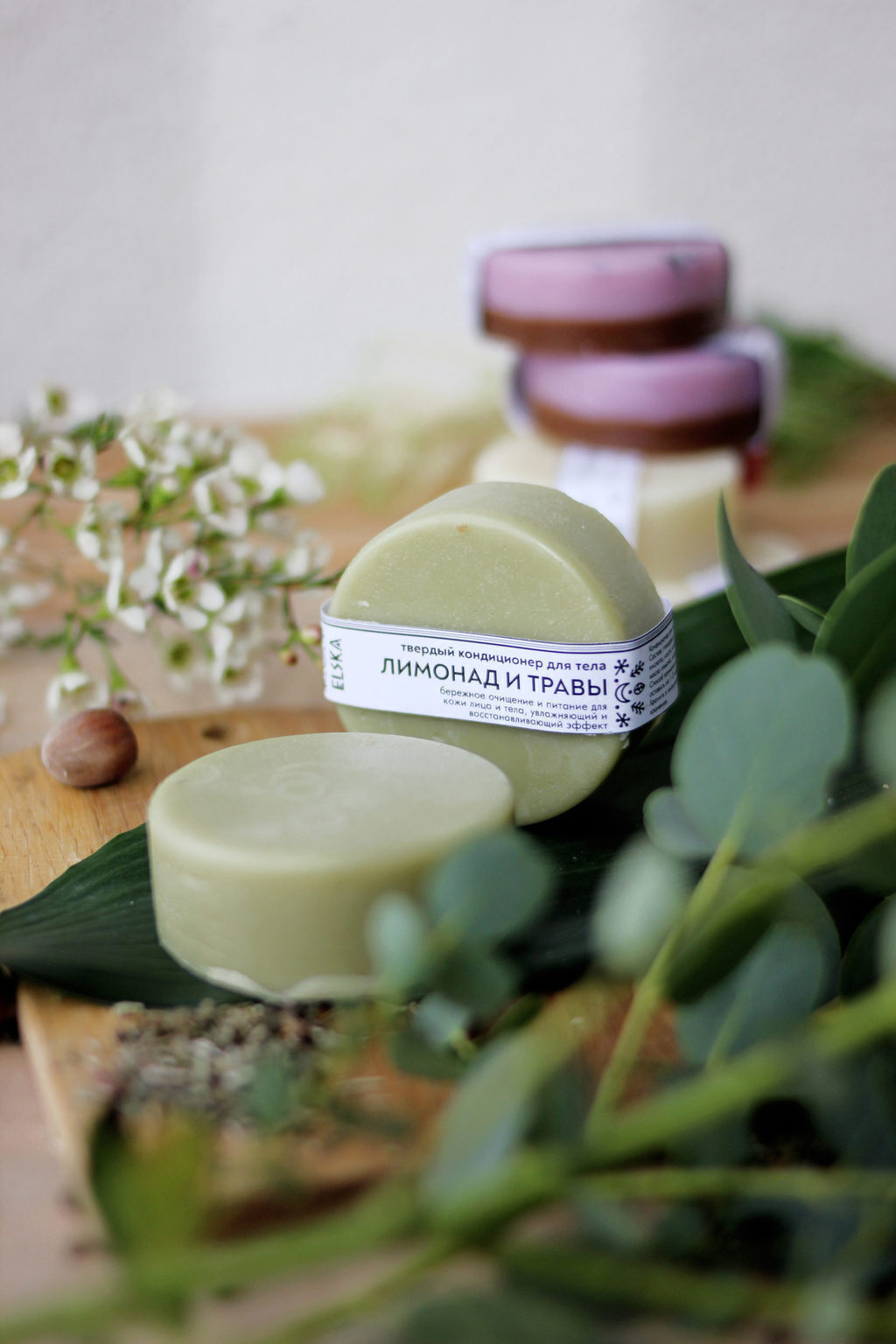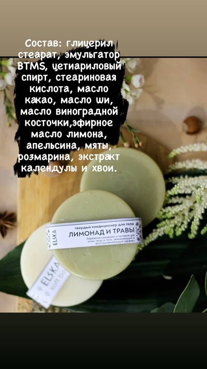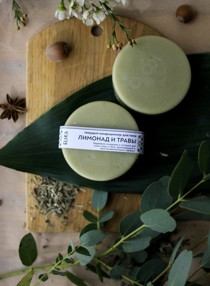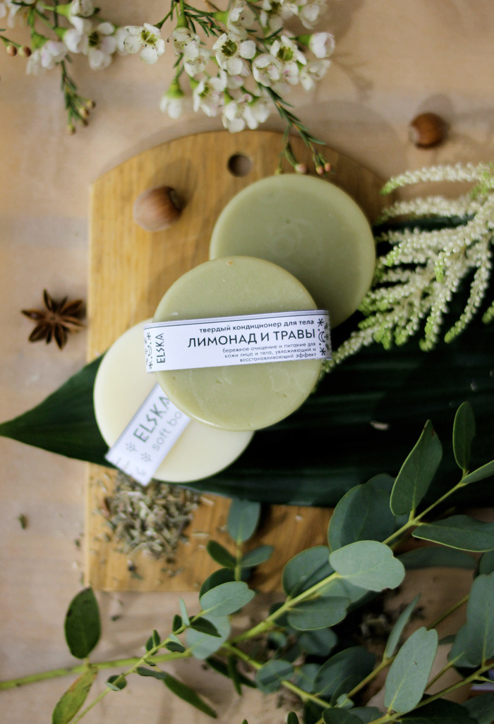 Твердый кондиционер для тела "Лимонад и травы" подходит для умывания, бритья и ежедневного ухода.
