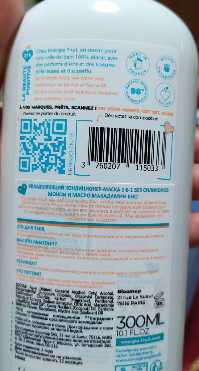 ENERGIE FRUIT Увлажняющий кондиционер-маска 2-в-1 без силиконов МОНОИ и МАСЛО МАКАДАМИИ БИО 300 мл