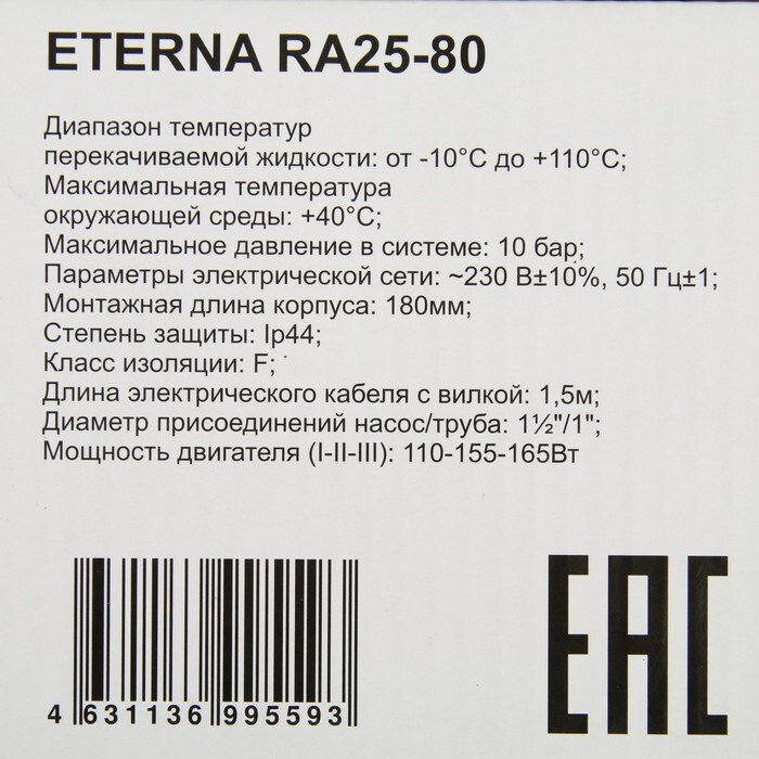 Насос циркуляционный ETERNA RА25-80, напор 8 м, 8 м3/час, кабель 1.5 м, 165 Вт ETERNA