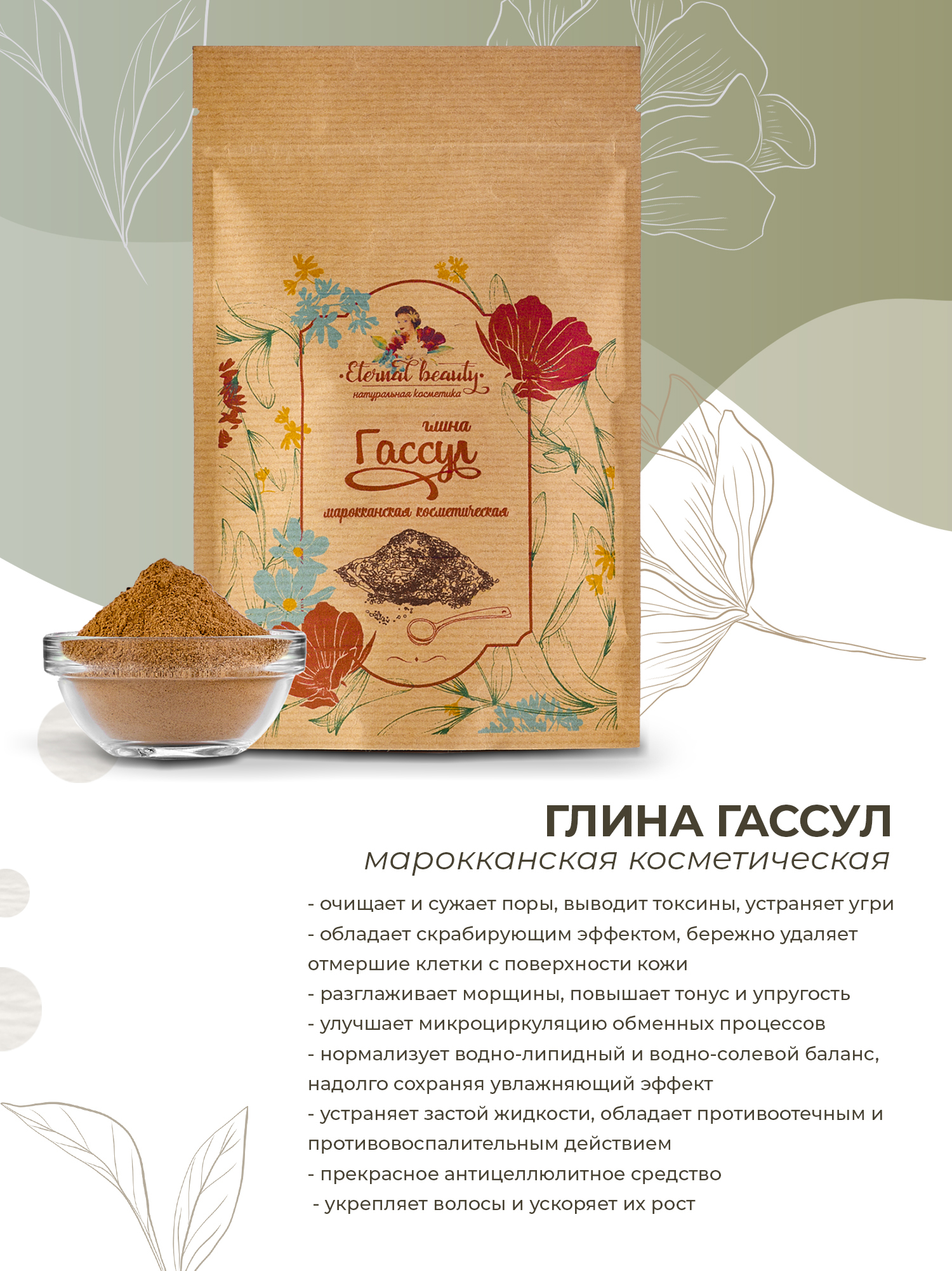 Eternal beauty Глина гассул косметическая для лица, тела, волос, шампуней, обертываний, ванн 200 гр.