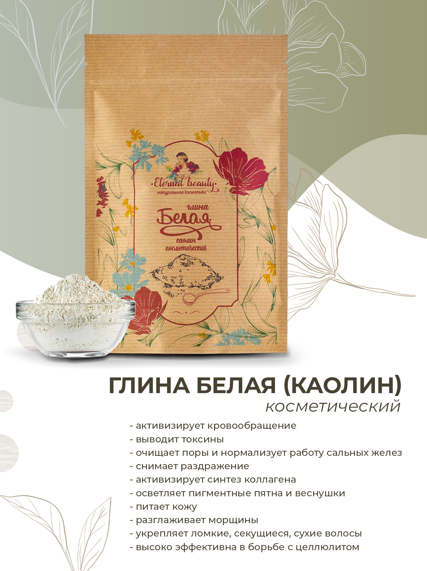 Eternal beauty Глина белая (каолин) косметическая для лица, тела, волос, шампуней, обертываний, ванн 200 гр.
