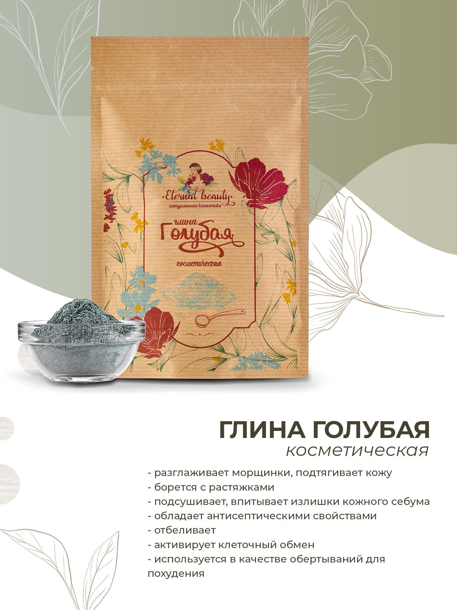 Eternal beauty Глина голубая косметическая для лица, тела, волос, шампуней, обертываний, ванн 200 гр.