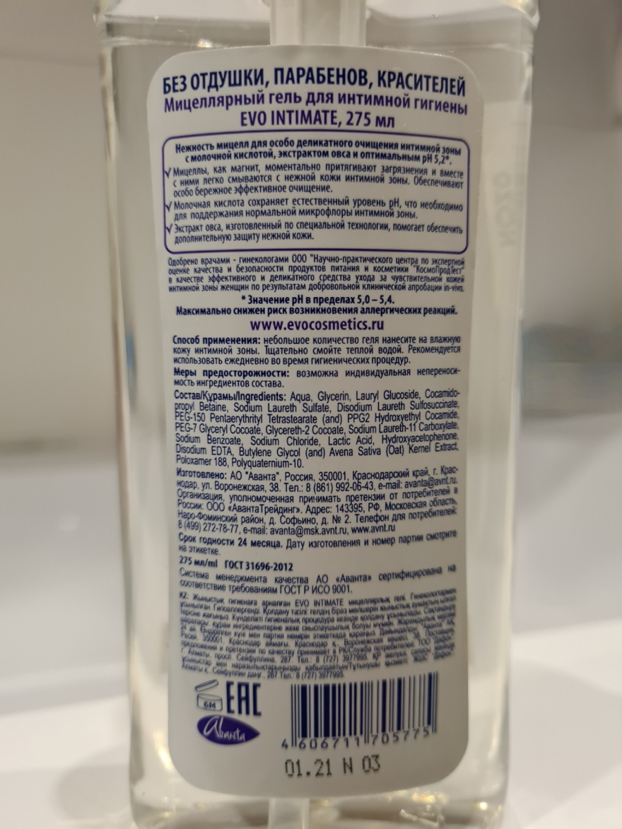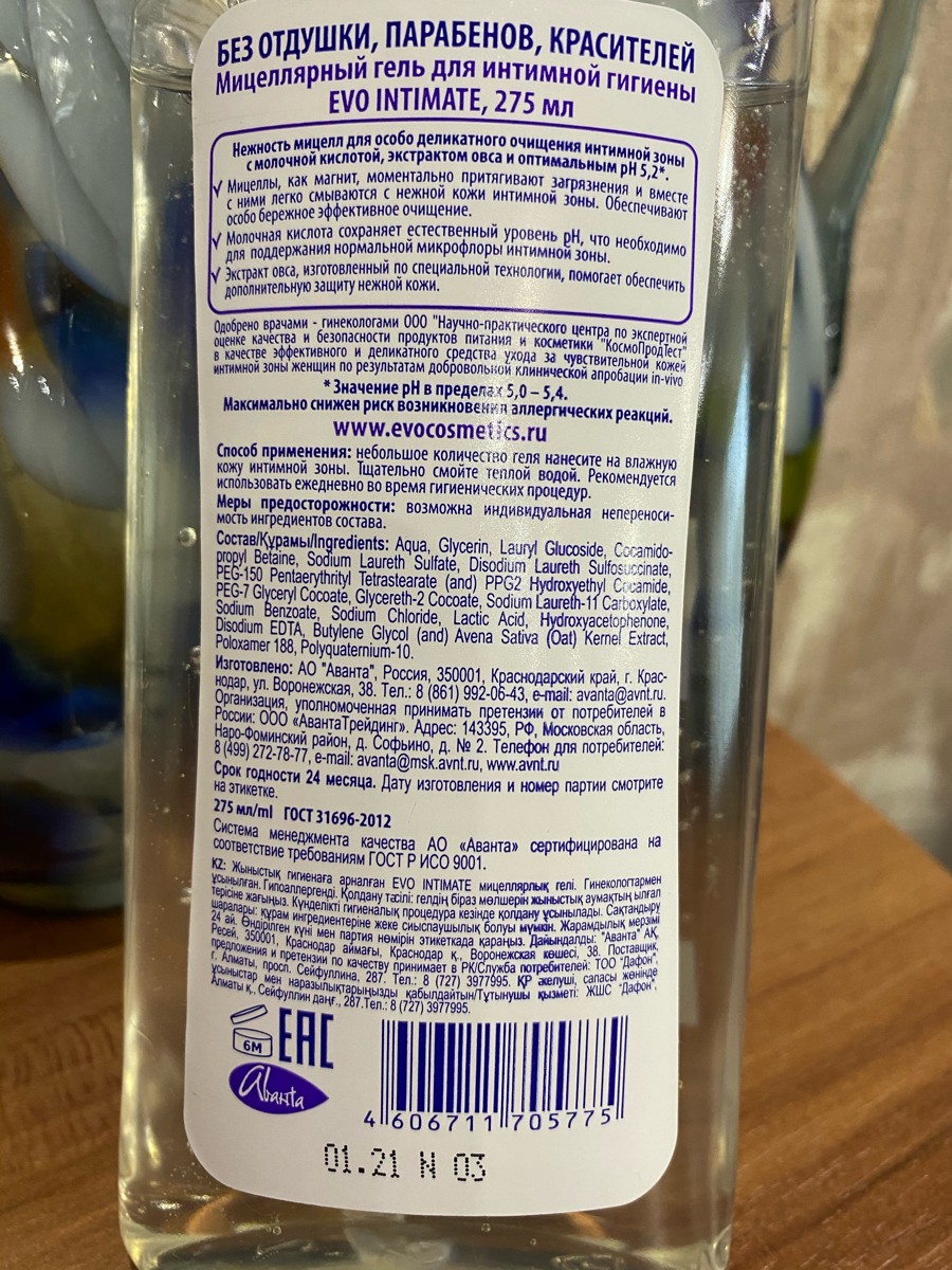 EVO Intimate Мицеллярный гель для интимной гигиены с молочной кислотой, рН 5,2, 275 мл