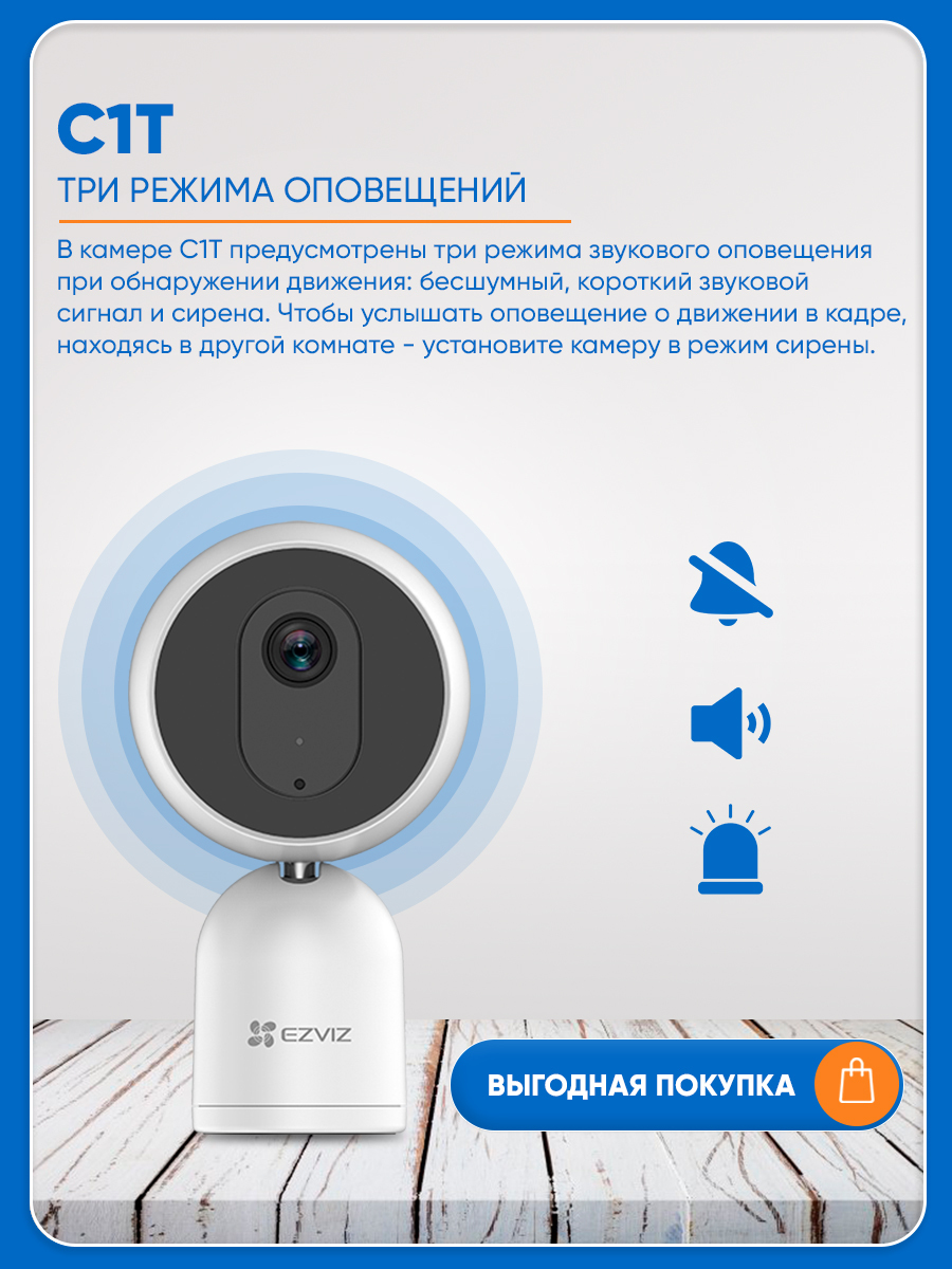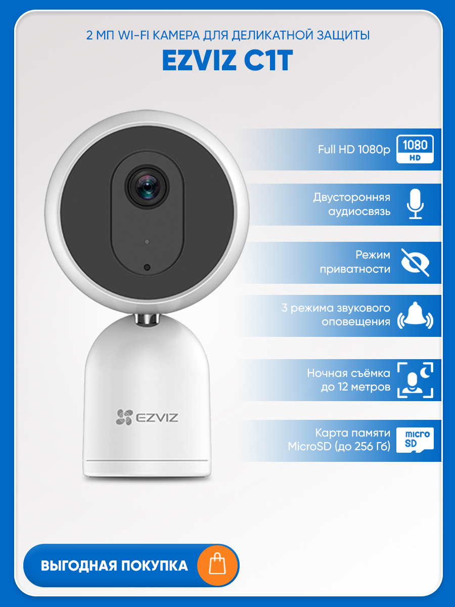 Умная Wi-Fi камера Ezviz C1T - 2Мп для дома с микрофоном и динамиком