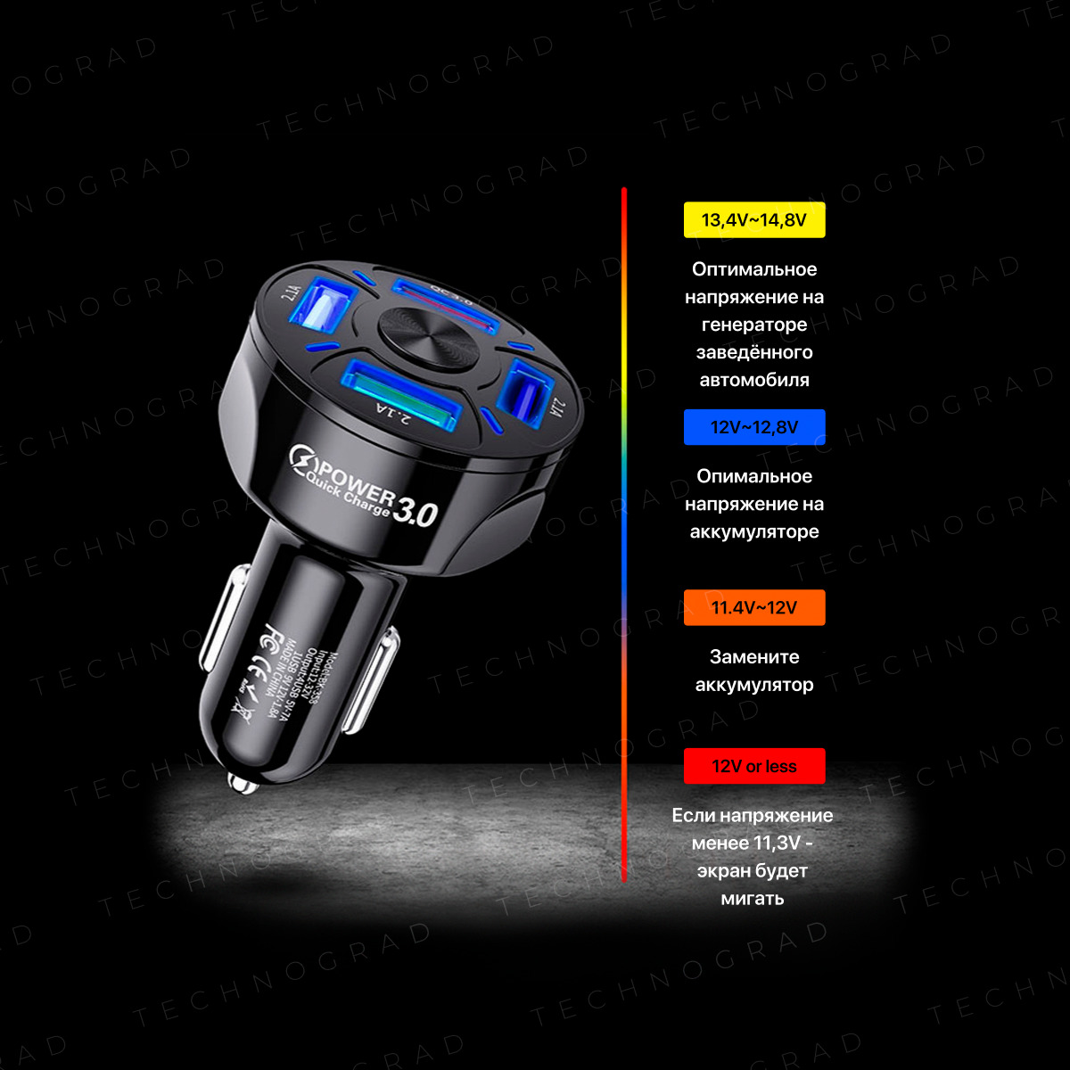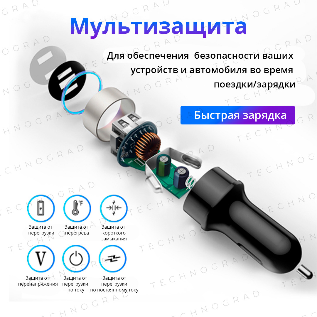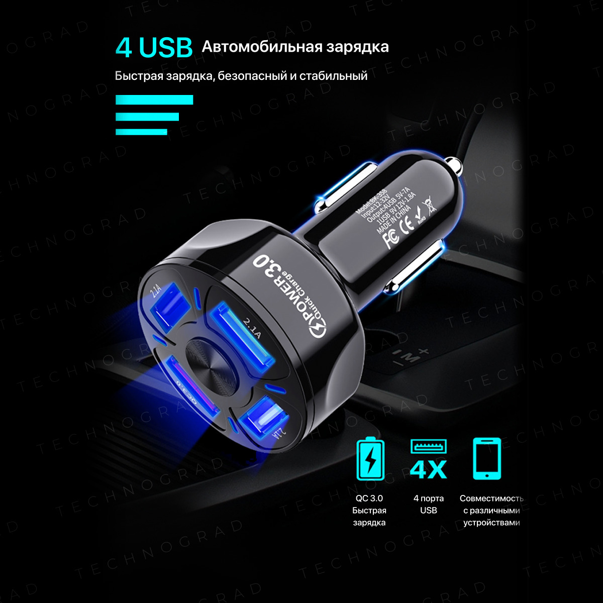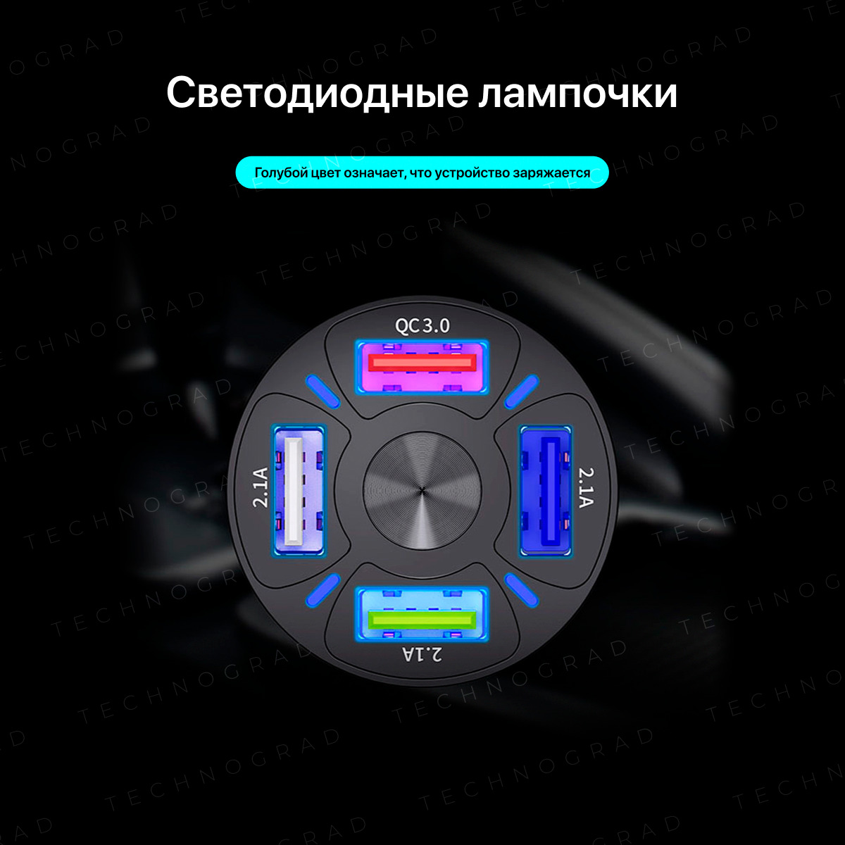 Автомобильное зарядное устройство в прикуриватель 4 порта USB. Зарядка в машину QC3.0