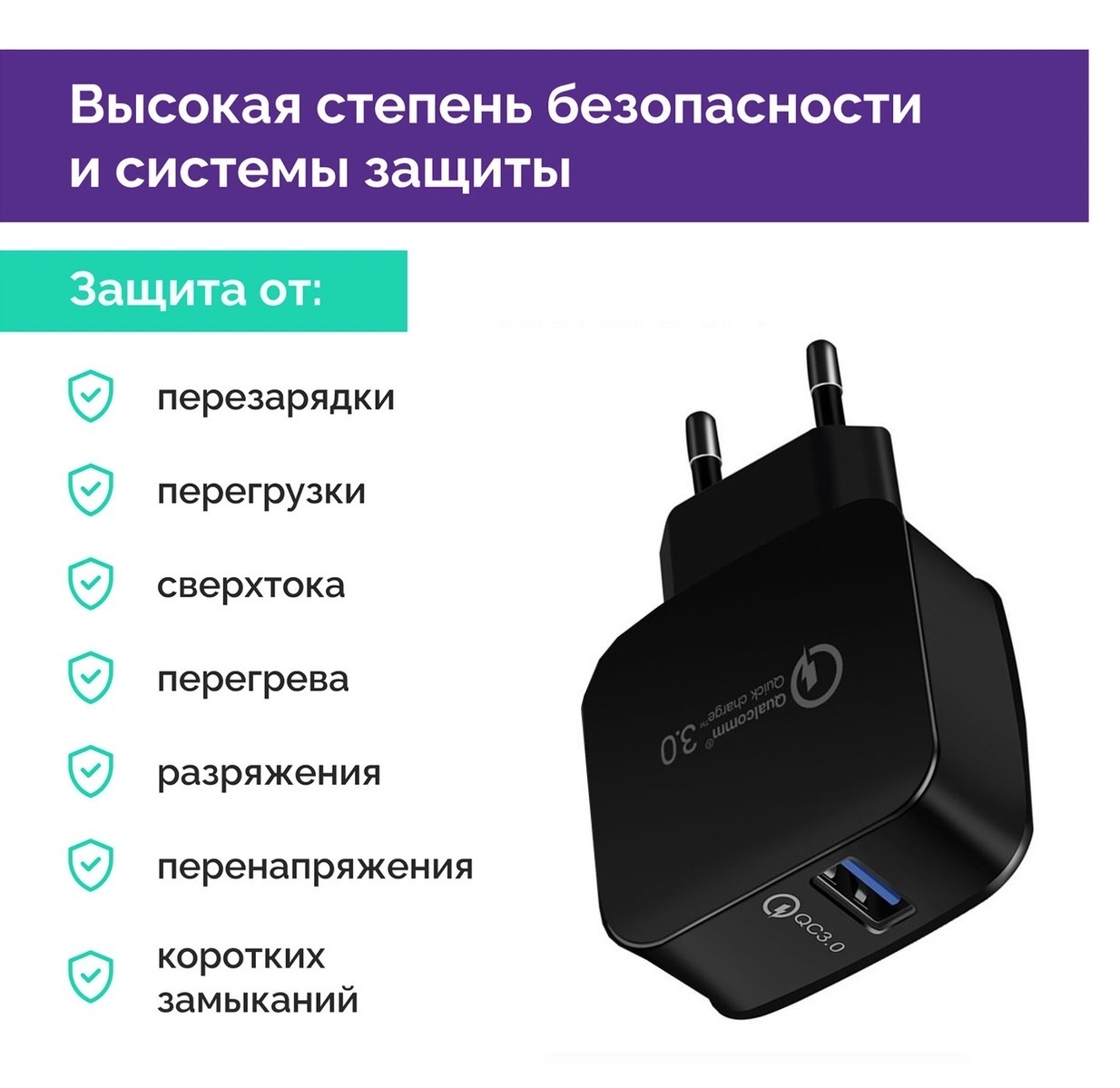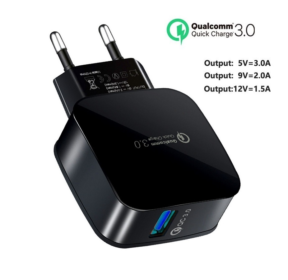 Адаптер питания с функцией быстрой зарядки QC 3.0, 100/220V - 1 порт USB 3.0, 5/9/12V, 3 А, черный