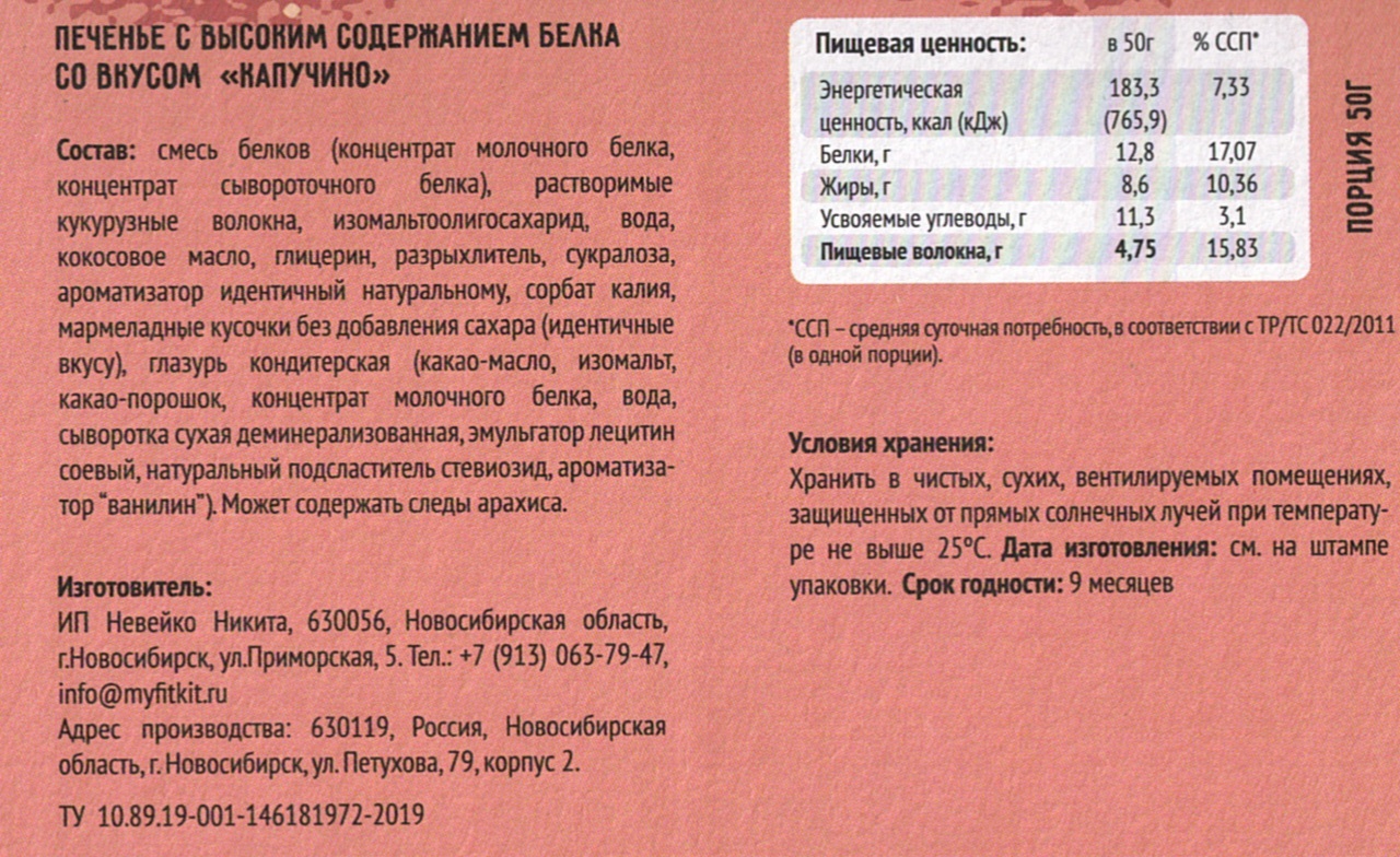 Протеиновое печенье в шоколаде без сахара Fit Kit Chocolate Protein Cookie, 5шт x 50г (капучино)