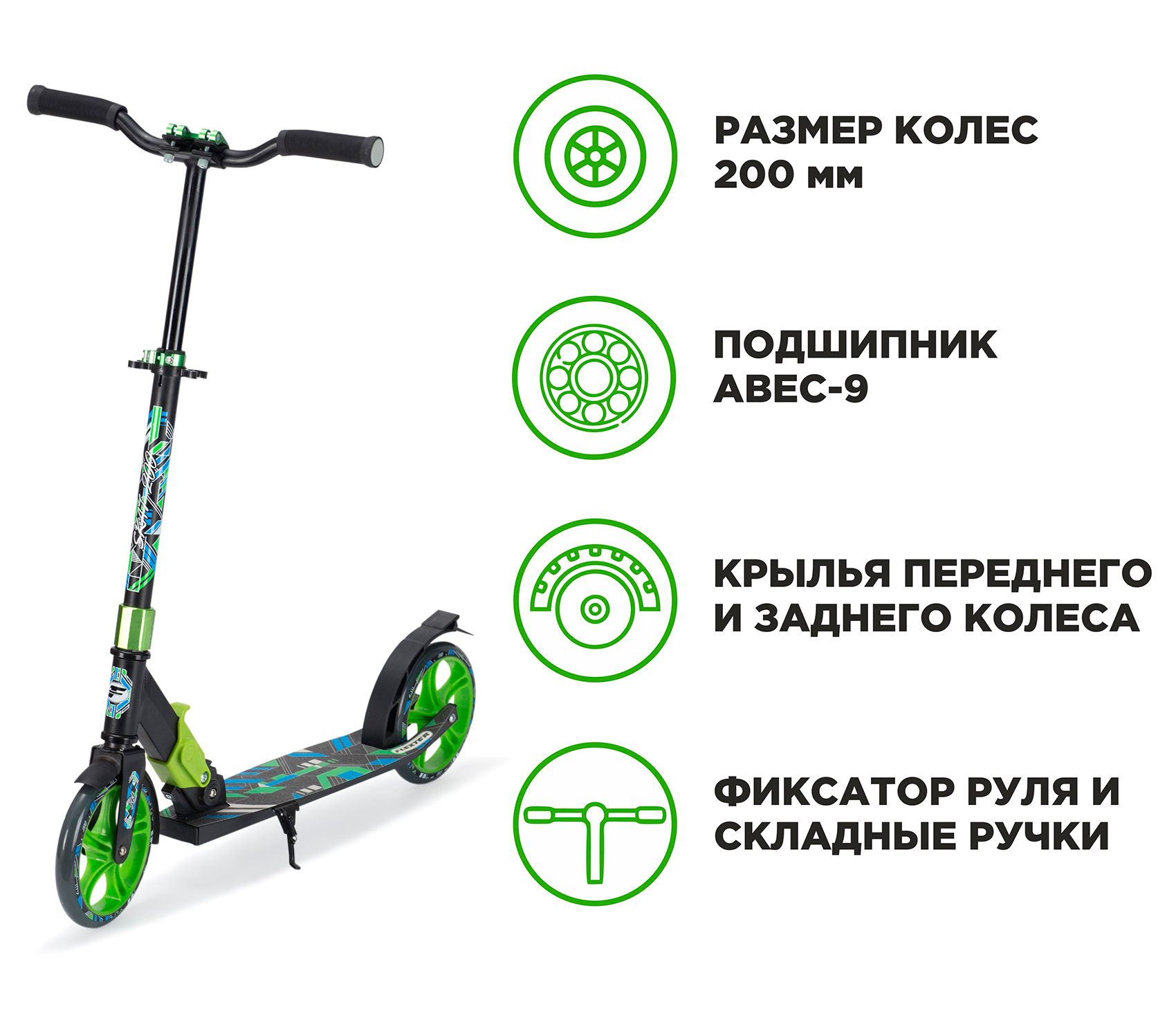 Самокат Городской FLEXTER Городской SKAT 200 черный/салатовый, 200 мм