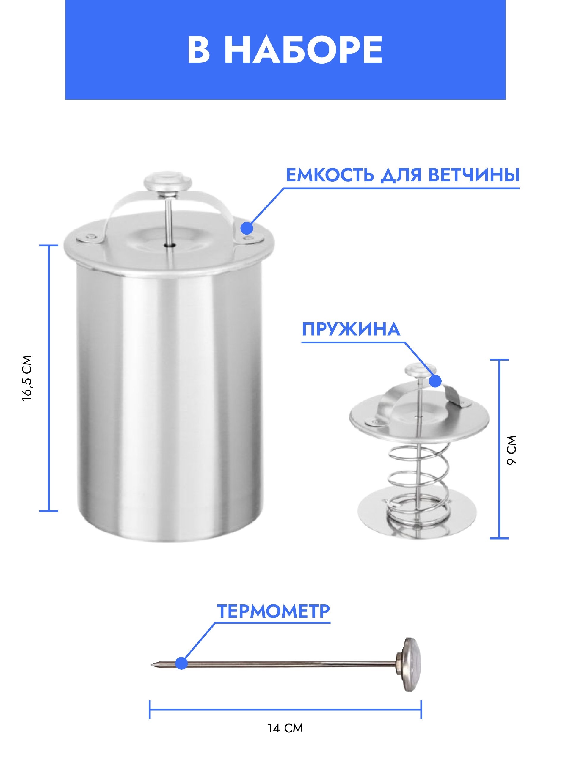 Ветчинница с термометром из нержавеющая стали. Для приготовления домашней колбасы и ветчины