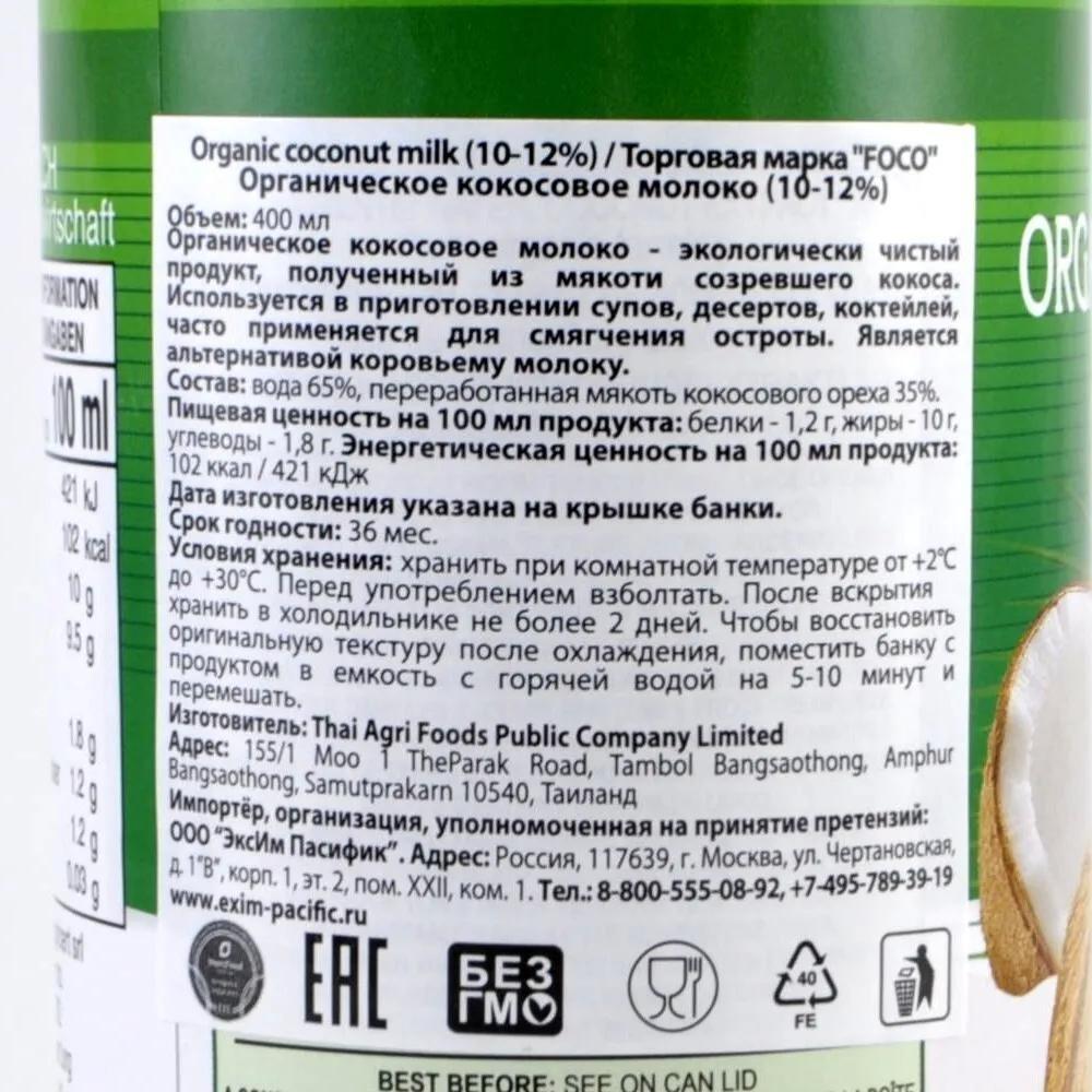 Органическое кокосовое молоко FOCO (жирность10-12%), 400 мл, евролист