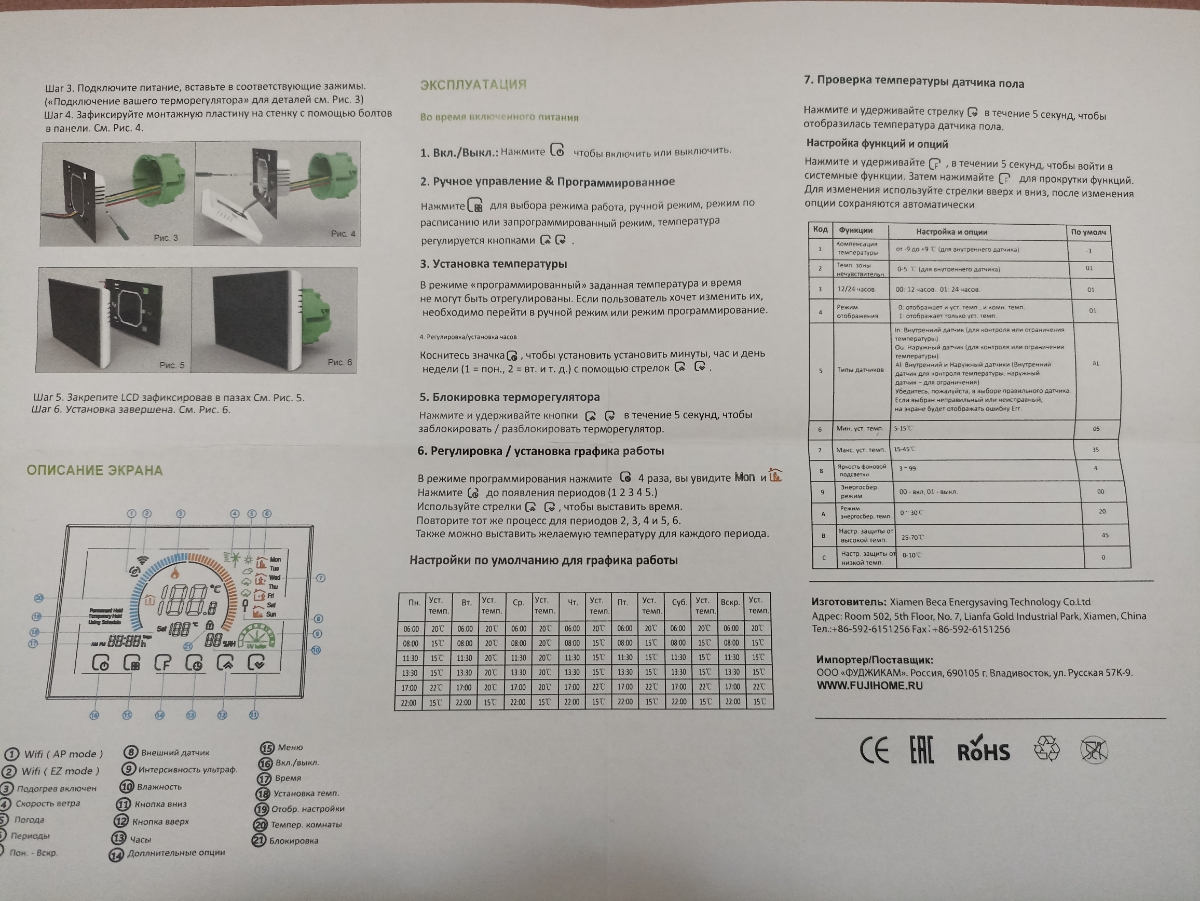 Терморегулятор/термостат FUJIHOME BHT-8000W / программируемый с WiFi до 3500Вт для теплого пола