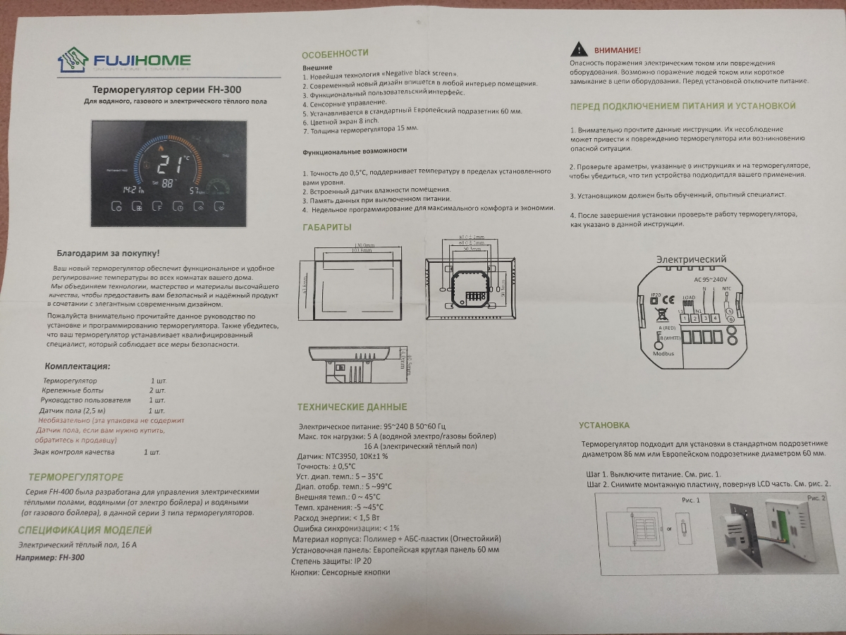Терморегулятор/термостат FUJIHOME FH-300B, программируемый до 3500Вт для теплого пола