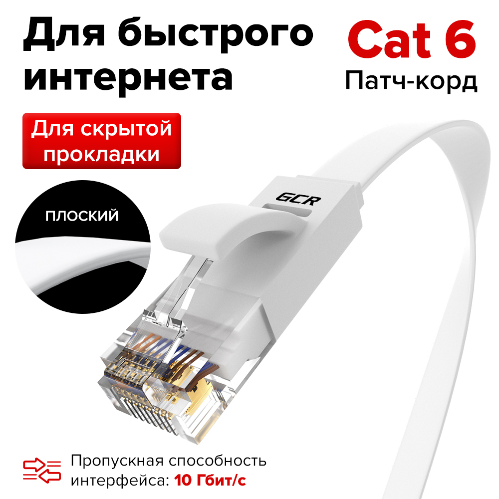Патч-корд плоский UTP кабель для интернета GCR PROF 1.5м КАТ.6 ethernet high speed 10 Гбит/с белый