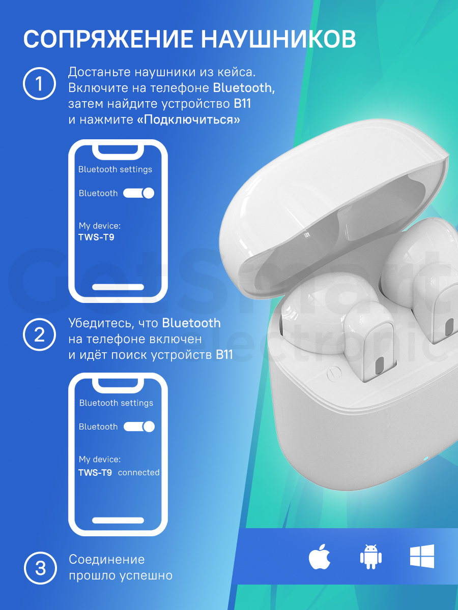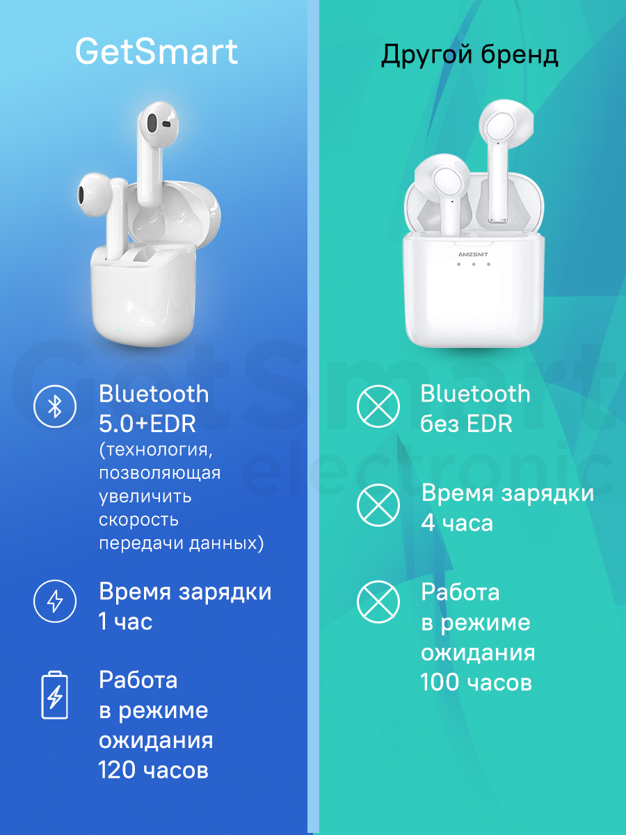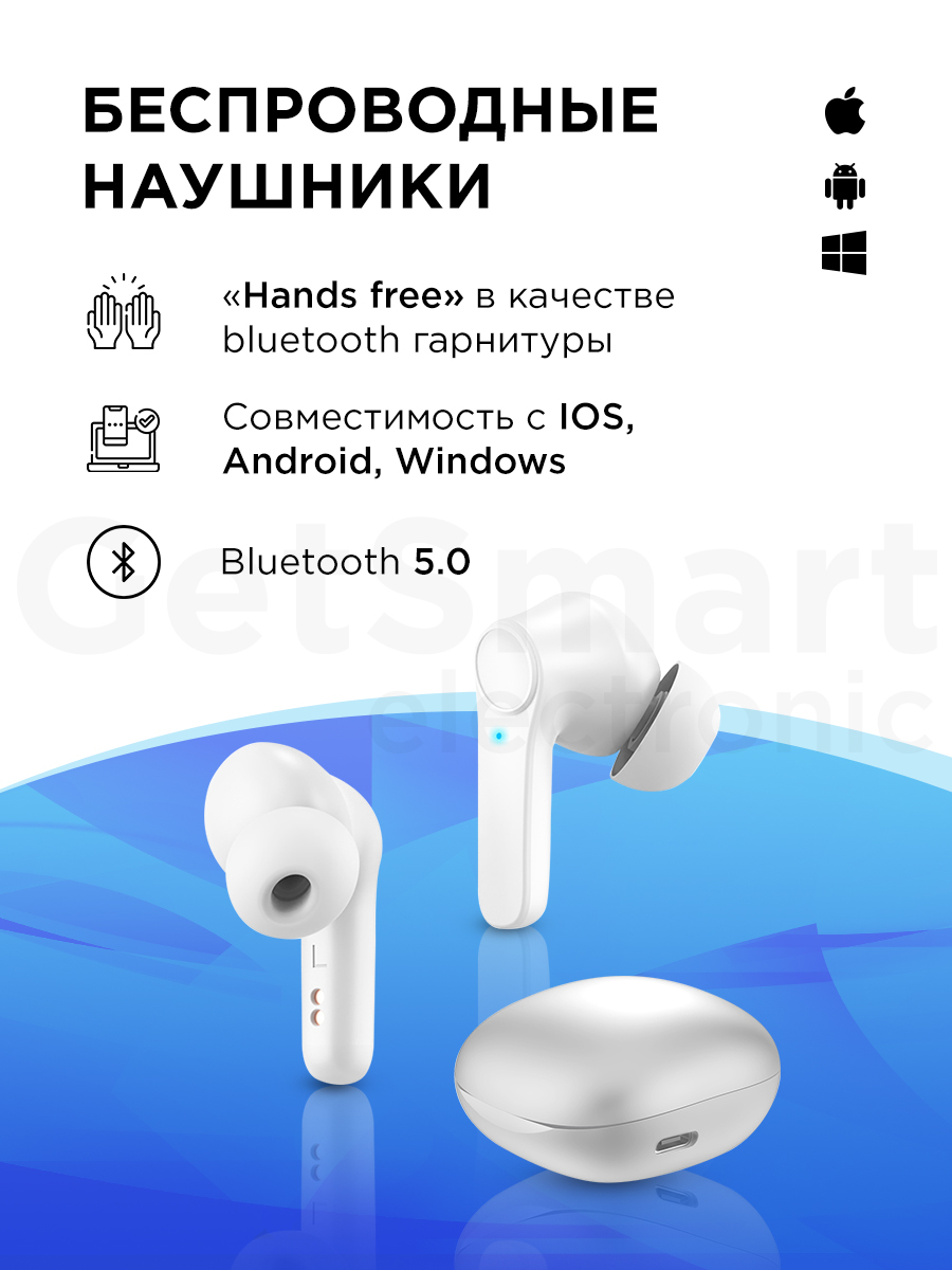 Наушники беспроводные GetSmart electronics TWS, Bluetooth 5.0 + EDR, для IPhone, Android и Windows